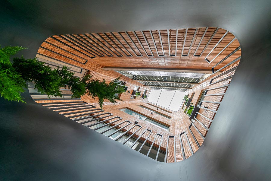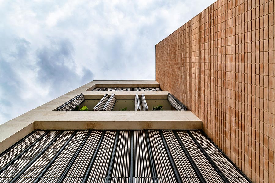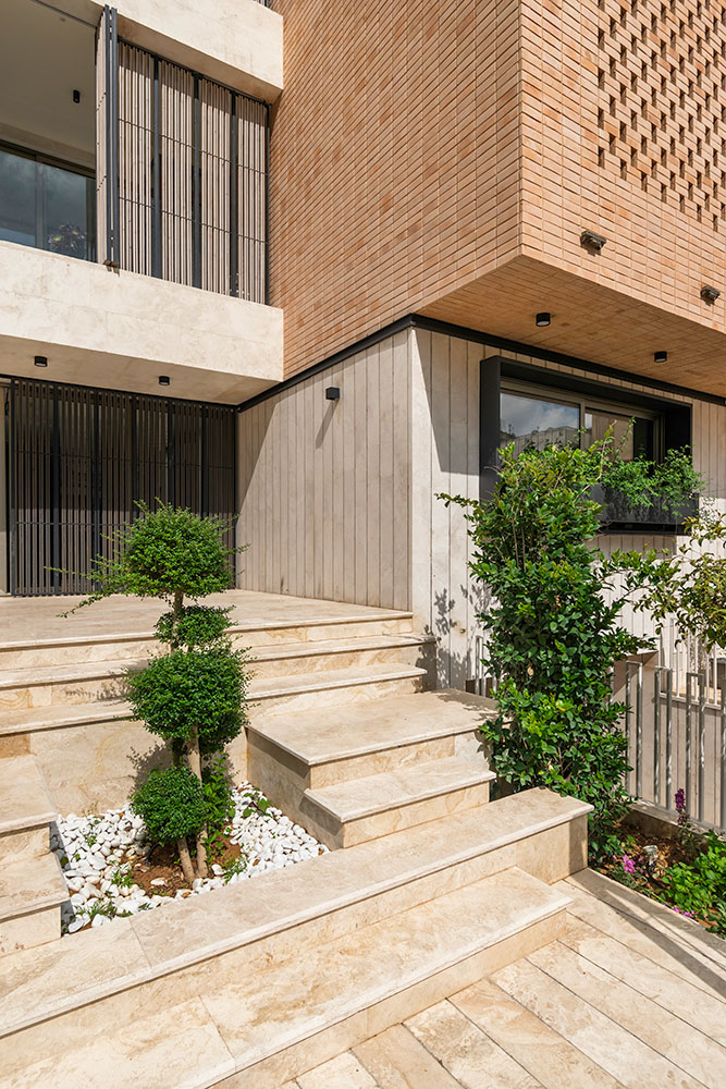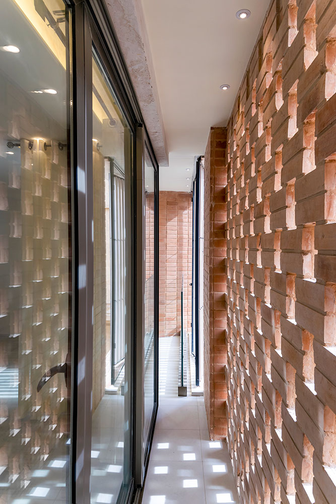 در جهت حفظ حریم خصوصی در بخشی از اتاق اصلی که به محل قرارگیری تختخواب اختصاص دارد، شبکهی فخر مدین آجری طراحی شده که ضمن حفظ ارتباط چشمی مناسب با فضای بیرون، محرمیت لازم را فراهم میکند.