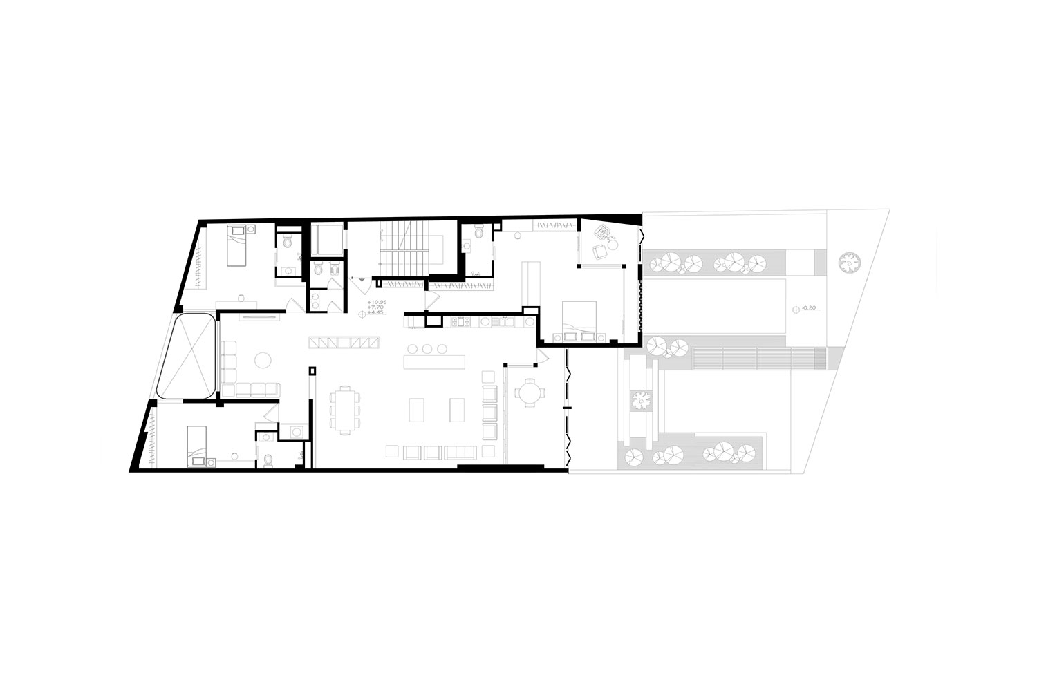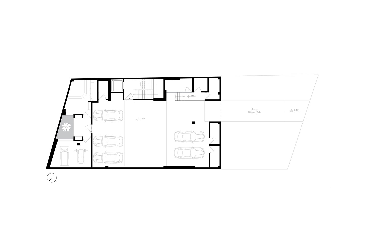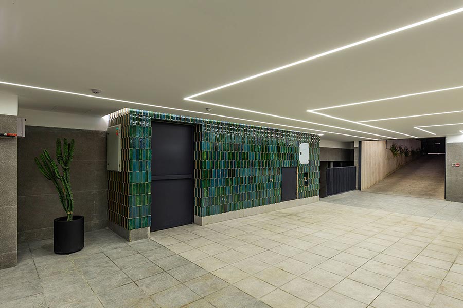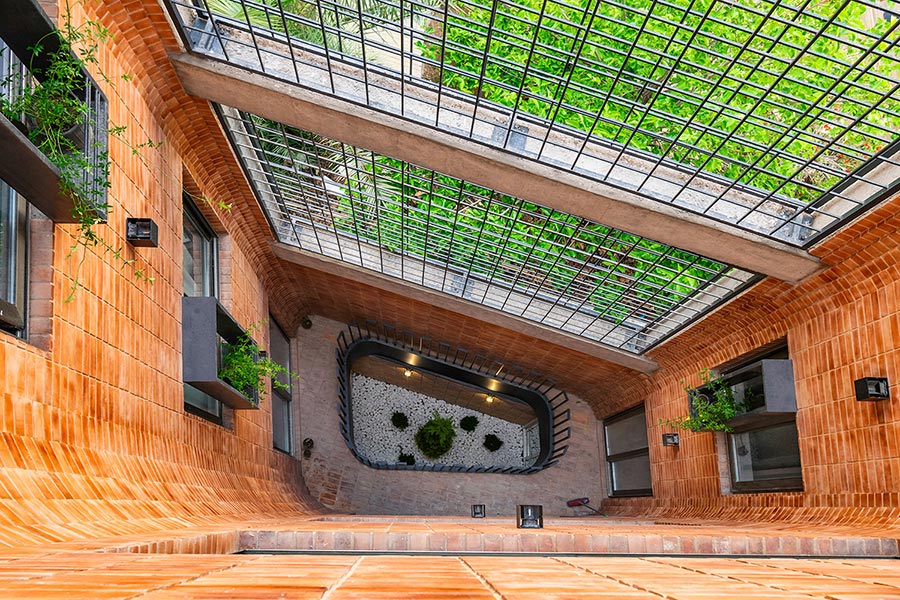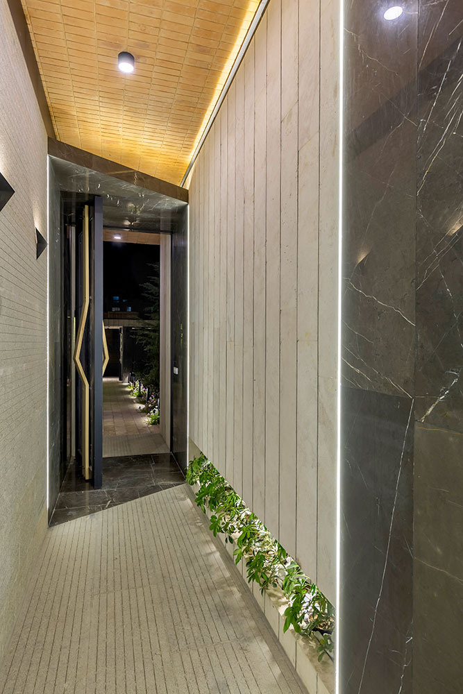 از دیگر موارد قابل توجه، جانمایی وید در مکانی است که موجب ارتباط مناسب با حیاط سرسبز پشتی میشد. این نورگیر منحنی تا زیرزمین در محل قرارگیری سونا، جکوزی و اتاق ورزش امتداد داده شده است. همین موضوع باعث شد که به واسطهی این کریدور عمودی، هوا در ساختمان به گردش در بیاید. در ادامه بنا، تا مرز سایت ادامه پیدا میکند و بجای دیوار با دو باکس برش خورده که هر کدام کاربری جداگانهای دارد، ارتباط کوچه و حیاط را فراهم میکند.