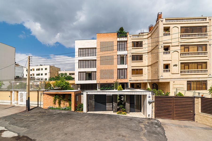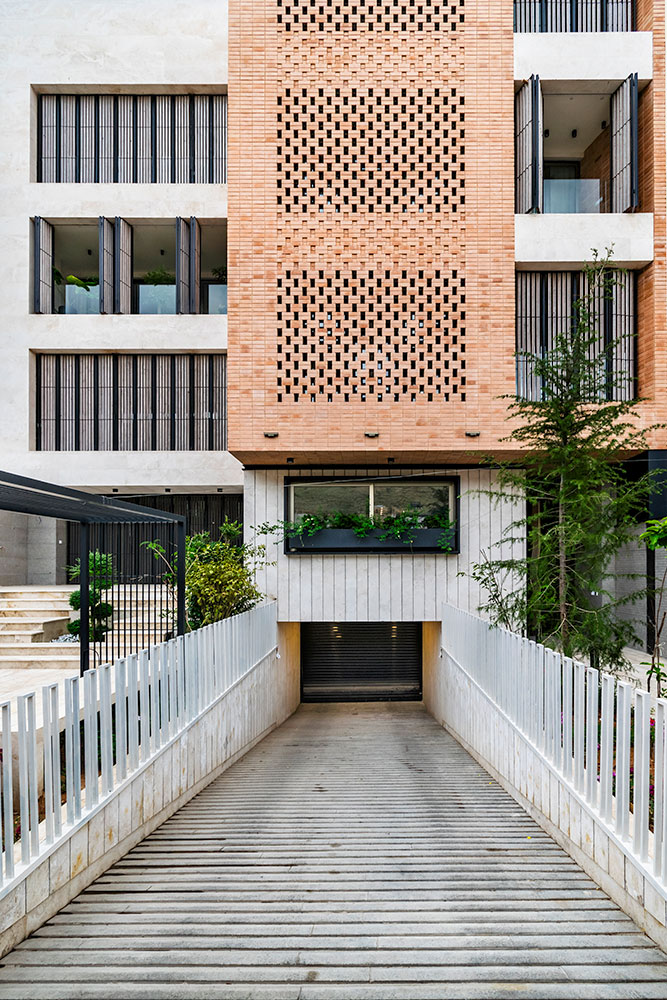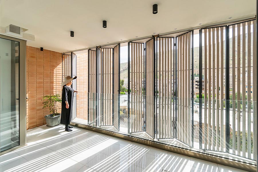 این پروژه یک آپارتمان مسکونی در شمال غربی شیراز با سایتی کاملا مشرف به کوه های دراک است که همین موضوع در درجه ی اول اهمیت در طراحی آن قرار گرفته است. ساختمان از روی هم لغزیدن چهار مکعب شکل گرفته که هرکدام با متریال جداگانه، هویت متمایزی نسبت به دیگری دارد. هر کدام از این باکسها محتوی فضاهای خصوصی و عمومی واحدها هستند. همانگونه که در خانههای دورهی زندیه (به نمایندگی از خانهی اصیل شیرازی) بخش مهمانخانه ارتباط تنگاتنگی با منظر سبز حیاط داشت، در این پروژه هم تلاش بر این بود که ایوانهایی تعاملی در بنا شکل بگیرد و پس از آن اتصالی منعطف با منظر کوهستان برقرار شود. در این راستا شبکهای متشکل از مدولهای شفاف و متحرک در جلوی ایوانها قرار داده شد. این مجموعه امکان حضور دائمی منظر کوهستان را در تمامی حالات اعم از باز، نیمهباز و کاملا بسته، فراهم مینمود.