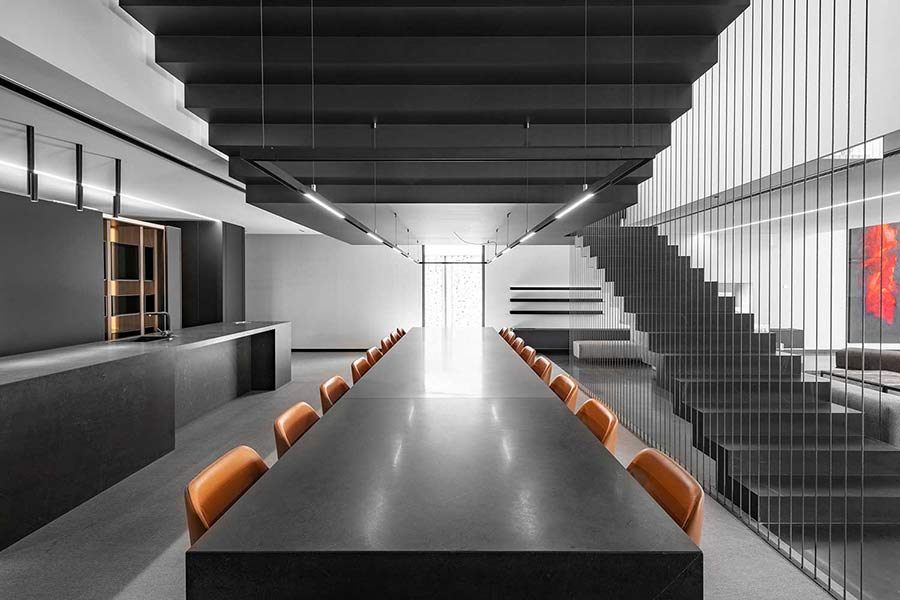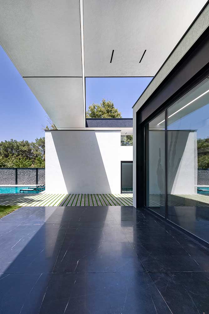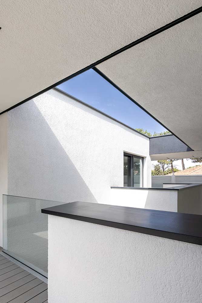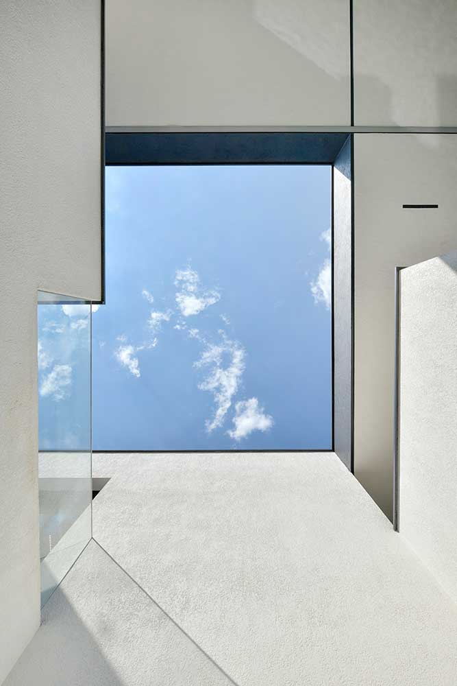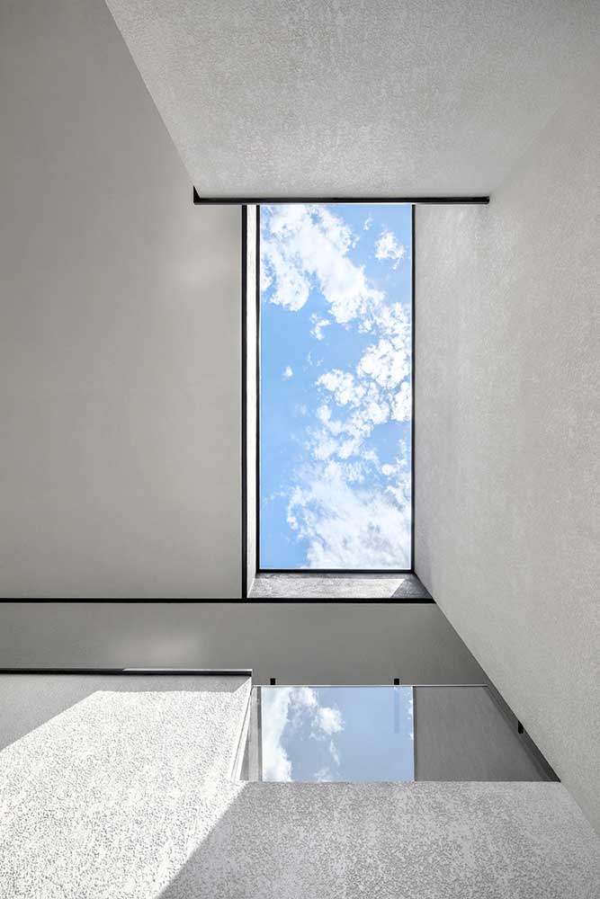 سقفی گسترده در ترکیب با فضاهای تراس، سایههای عمیق ایجاد میکند؛ قابی از آسمان جهت لذت چشم و حفاظت از اهالی خانه از آزار نور شدید آفتاب.