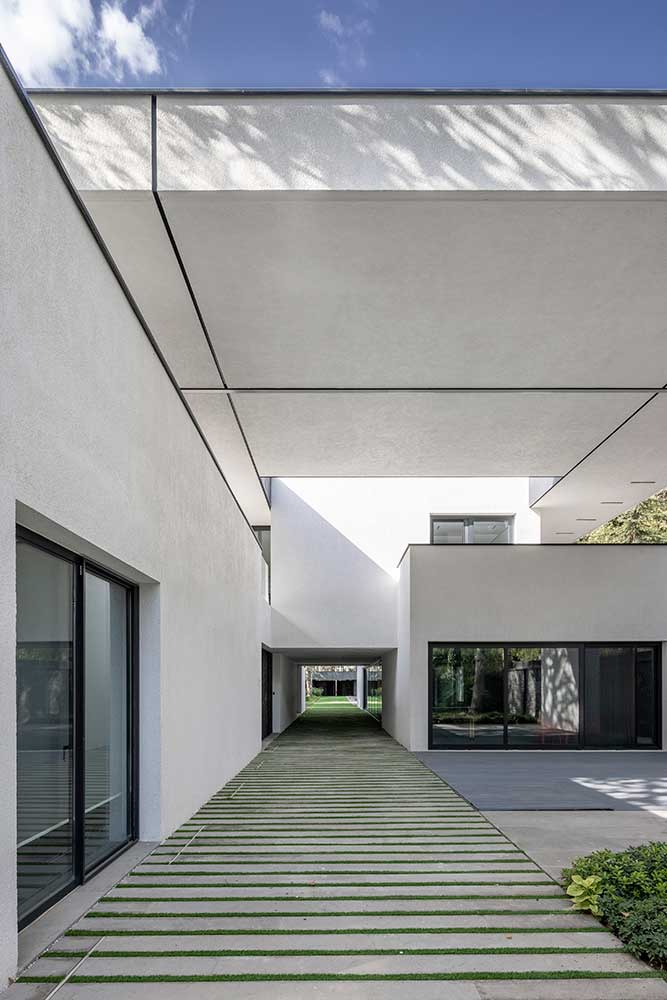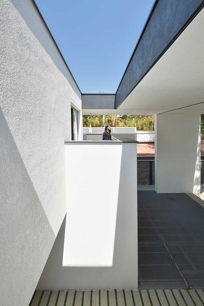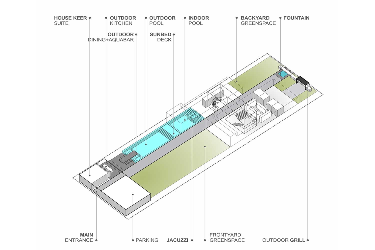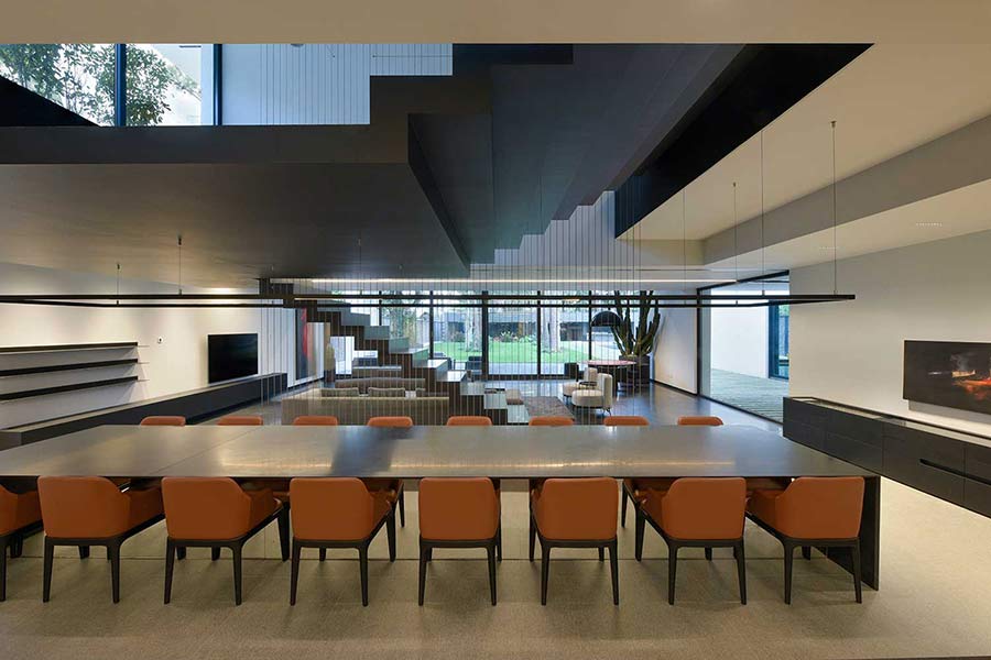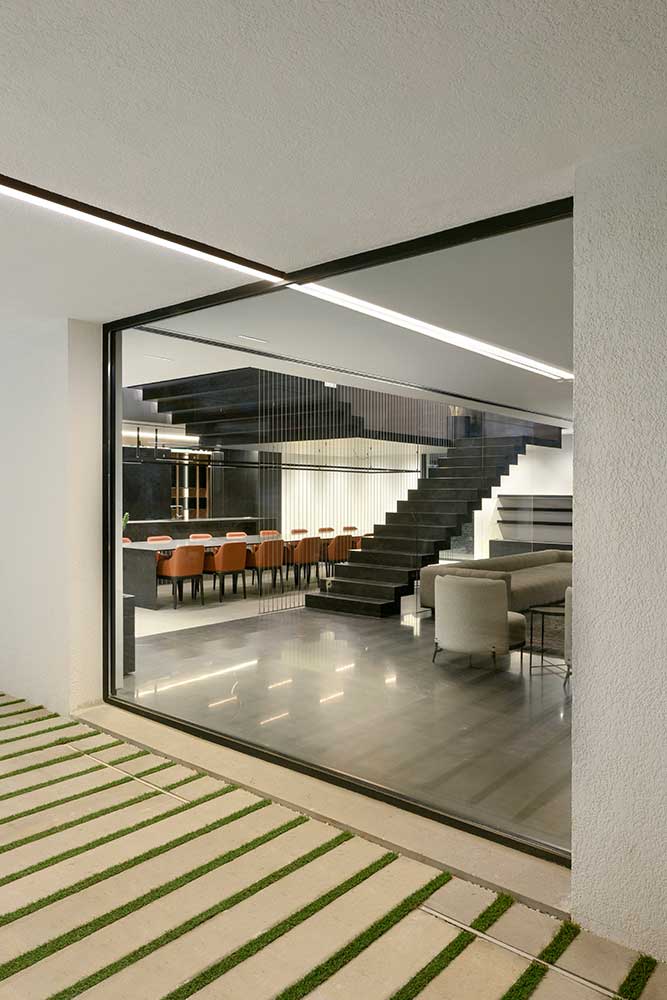 گفتگوی فضای بین حجم داخل و شکل بیرونی و امتداد هر یک در دیگری، منجر به تجربهی مشترک از فضای اصلی زندگی با لحظات خصوصی برای ساکنان خانه میشود.