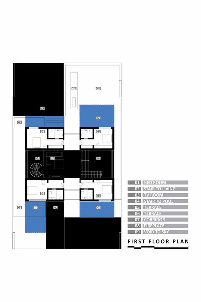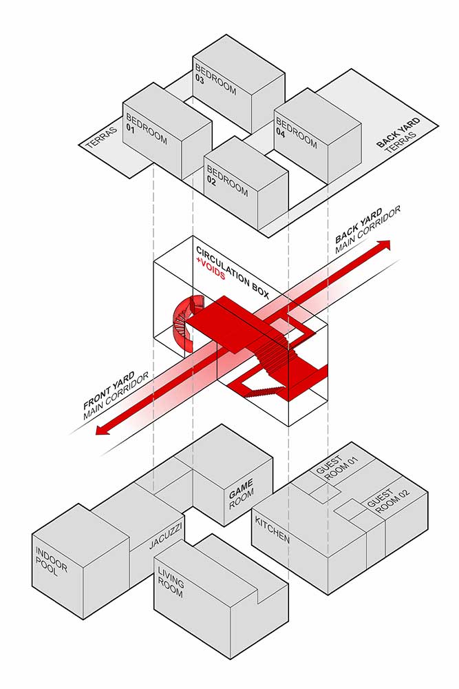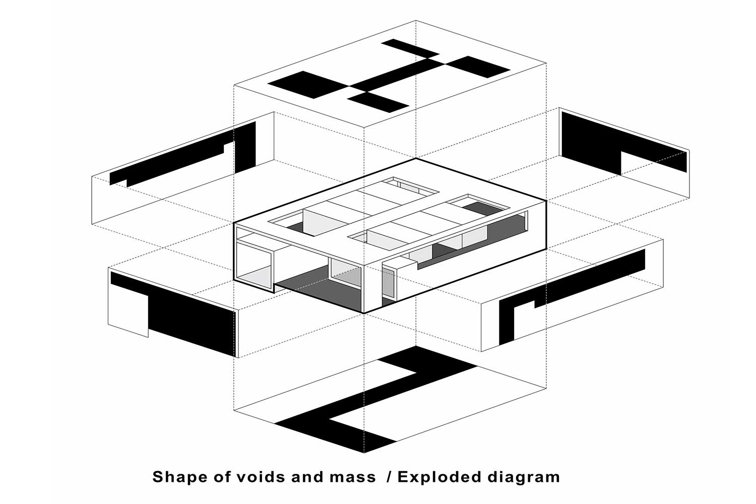 عملکردهای بسیار فشرده و انبوه در پروژه، حرکت به سمت ایجاد تخلخل و شکلگیری روند طراحی بر مبنای تعریف فضای خالی را تقویت نموده و به این ترتیب فضاهای داخلی خانه به صورت مجموعه ای از حجم های در تعامل با فضاهای خالی قرار می گیرند.