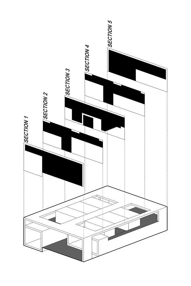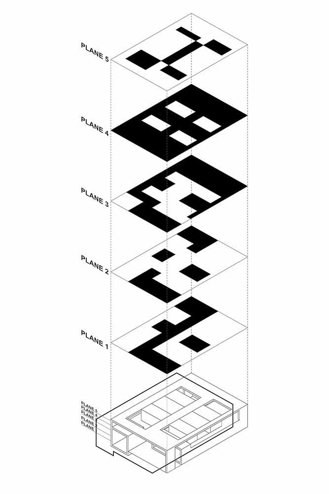 در این خانه، فضاها در چندین سطح به هم مرتبط میشوند، امتداد گشایش در سقف در طبقات زیرین و اثرگذاری آن در خلق فضاهای موازی با یکدیگر و ایجاد قابهایی که دید را تغییر جهت میدهند، از ایدههای معماری آن است.