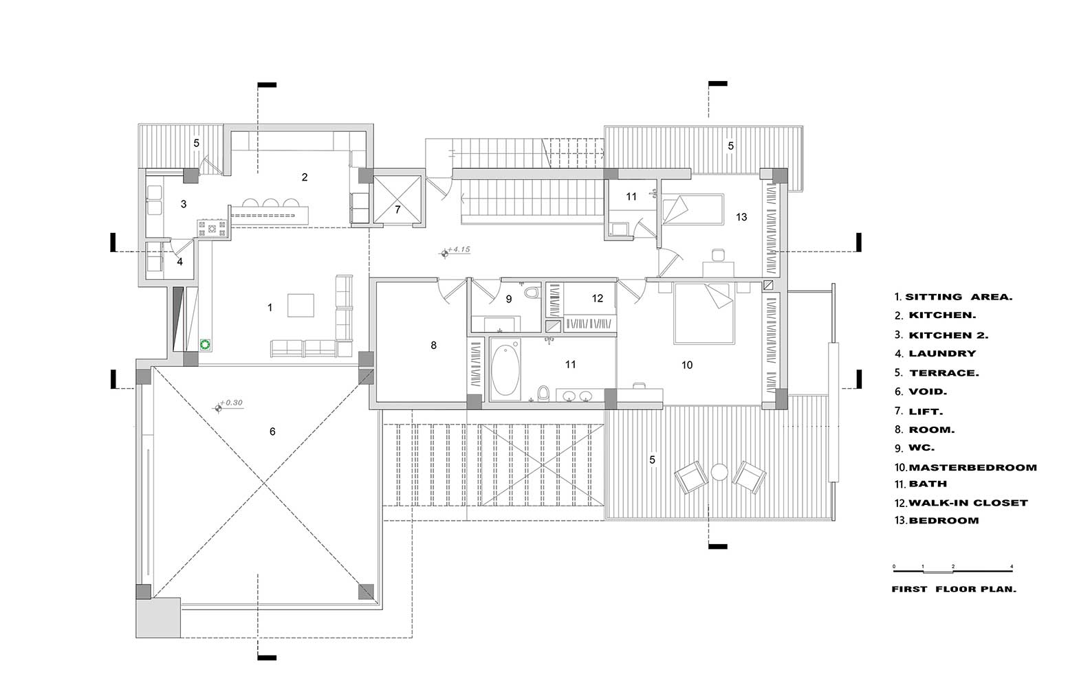 فضای پذیرایی رسمی خانه که با تناسبات ارتفاعی سقف، جداره های شیشه ای بلند و شومینه تبدیل به قلب خانه شده است، فضای نشیمن خصوصی در طبقه اول را به حیاط متصل کرده است.