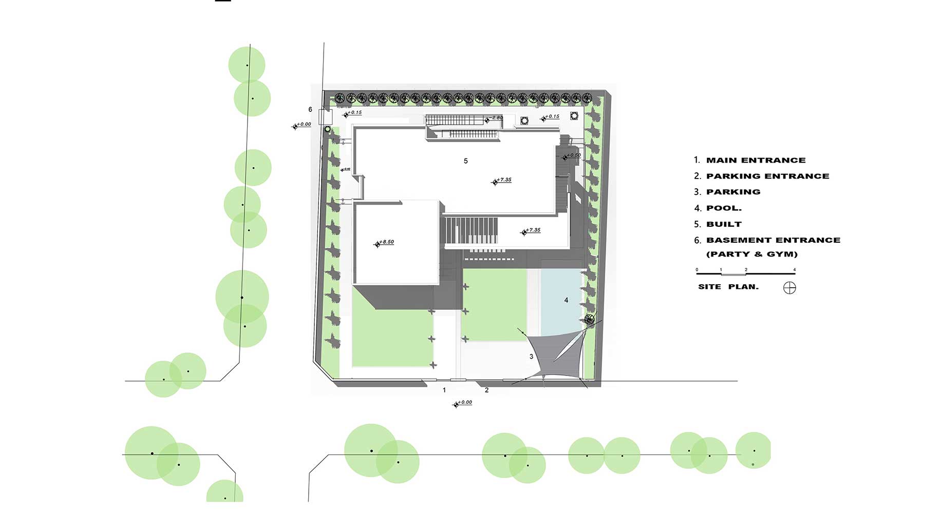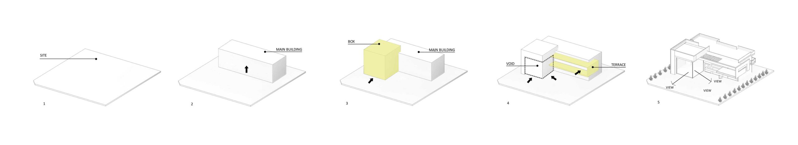 در این خانه ماهیت اصلی را ترکیب احجام کیوبیک ساده ای تشکیل داده است که روی صفحه ای که از سطح زمین بالا آمده است نشسته اند و فضاهای نیمه باز با استفاده از سطوح افقی و فرو نشستن ساختمان در دل زمین تعریف شده اند.