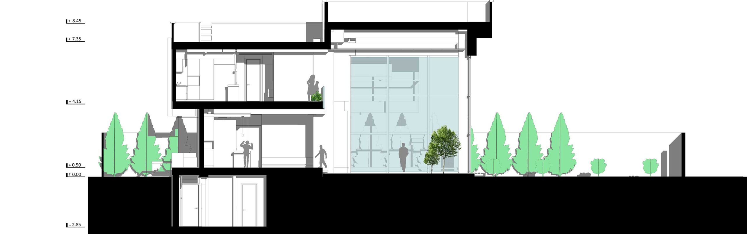 فضاهای مختلف بنا نیز به صورت افقی در سه سطح شامل فضاهای خصوصی (اقامت دائم در طبقهی اول)، نیمه خصوصی (پذیرایی خانوادگی و رسمی در طبقهی همکف) و فضاهای عمومی (سالن دورهمیهای دوستانه، سالن ورزش و اتاق کار در طبقه زیرزمین) صورت گرفته است.