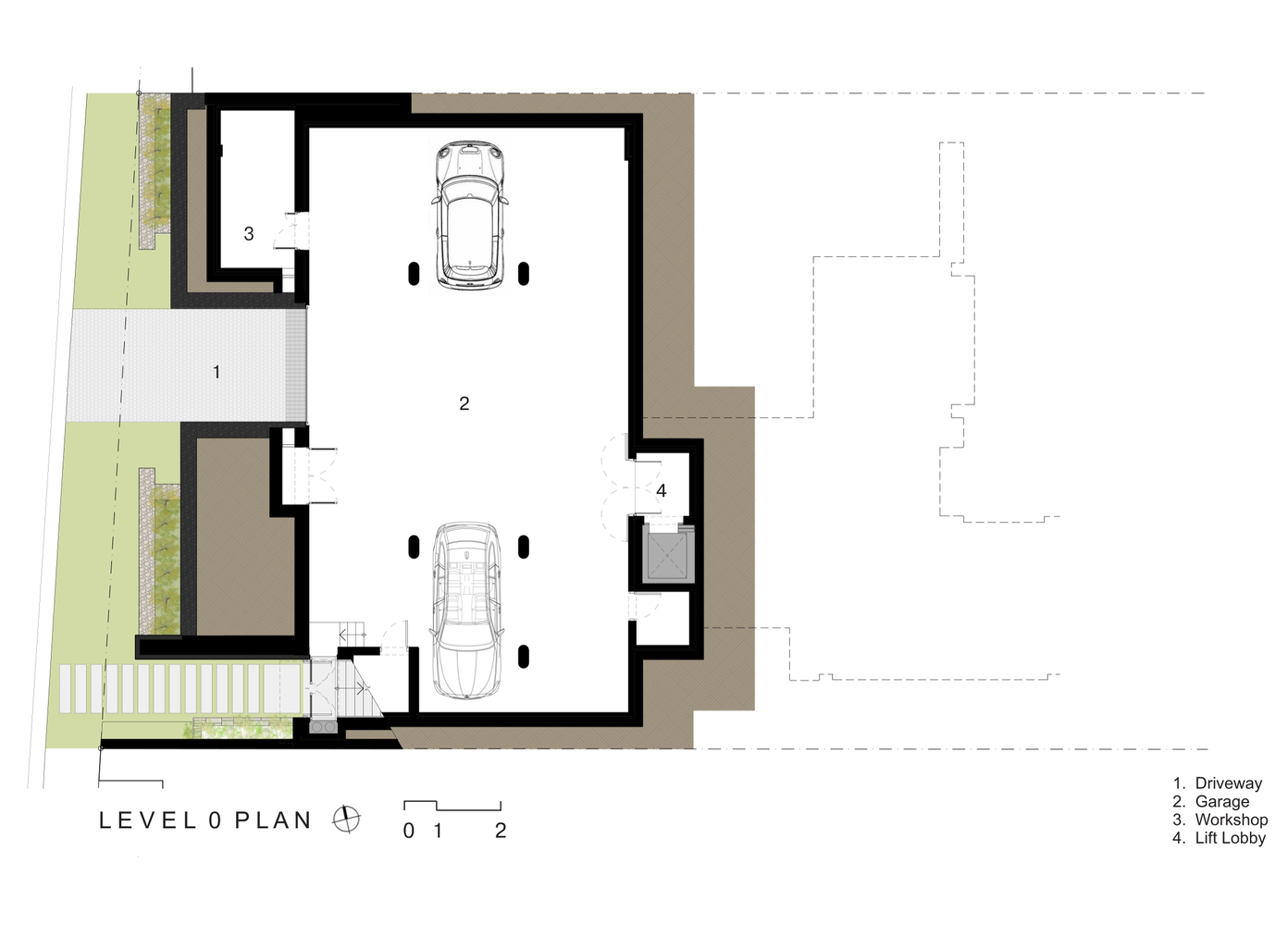 دیوارهای گابیونی گاراژ به گونه ای کاشته شده اند که با گذشت زمان بیش از حد رشد کنند و به این ترتیب منظره خیابان را برای رهگذران نرم کنند. آپارتمان مهمان در طبقه اول دارای منظره ای کامل از جاده، به دریای آن سوی آن را تشکیل داده است و با استفاده از یک دیوار کرکره ای از چوب سدر به آن حریم خصوصی داده شده است.