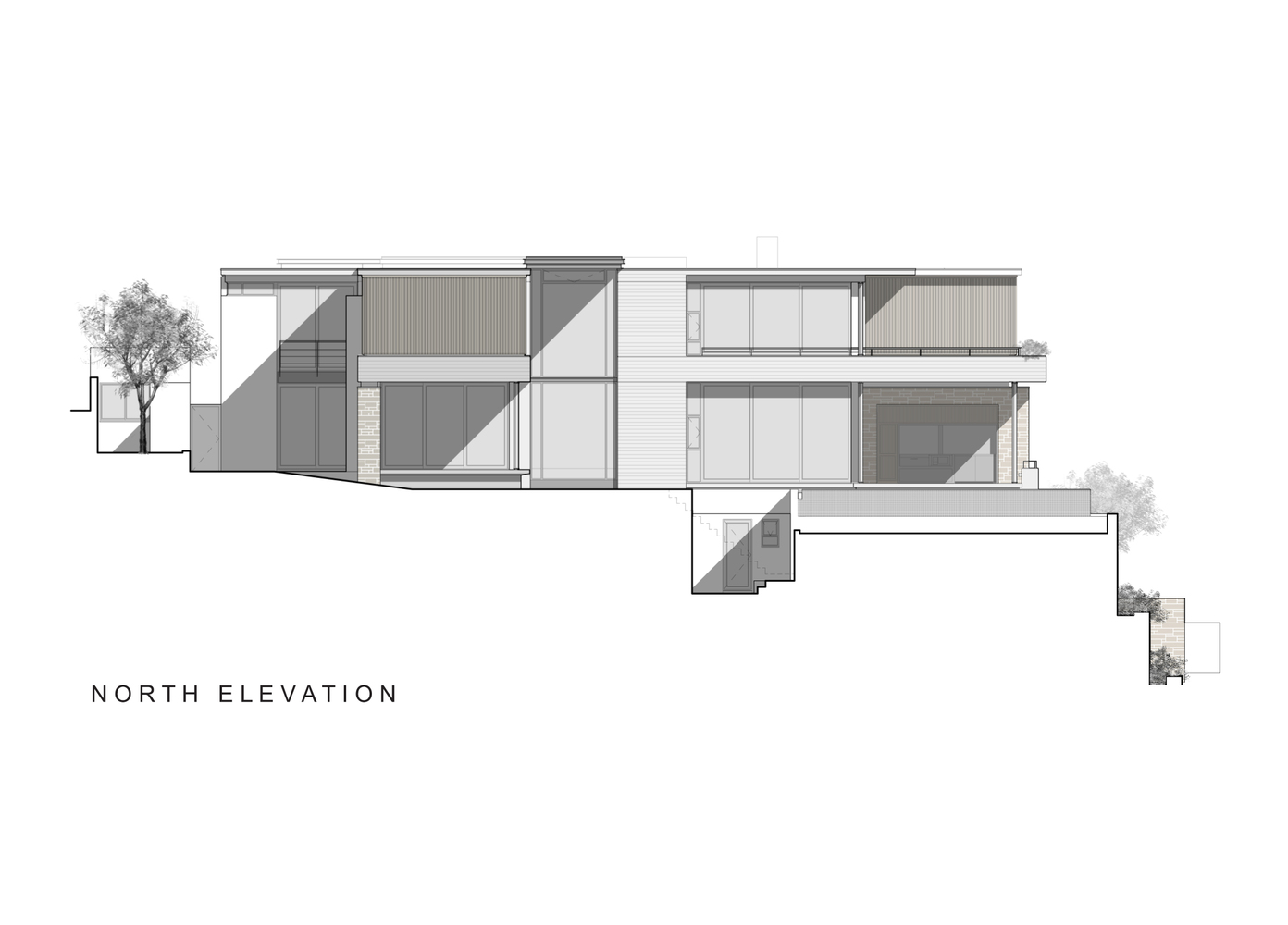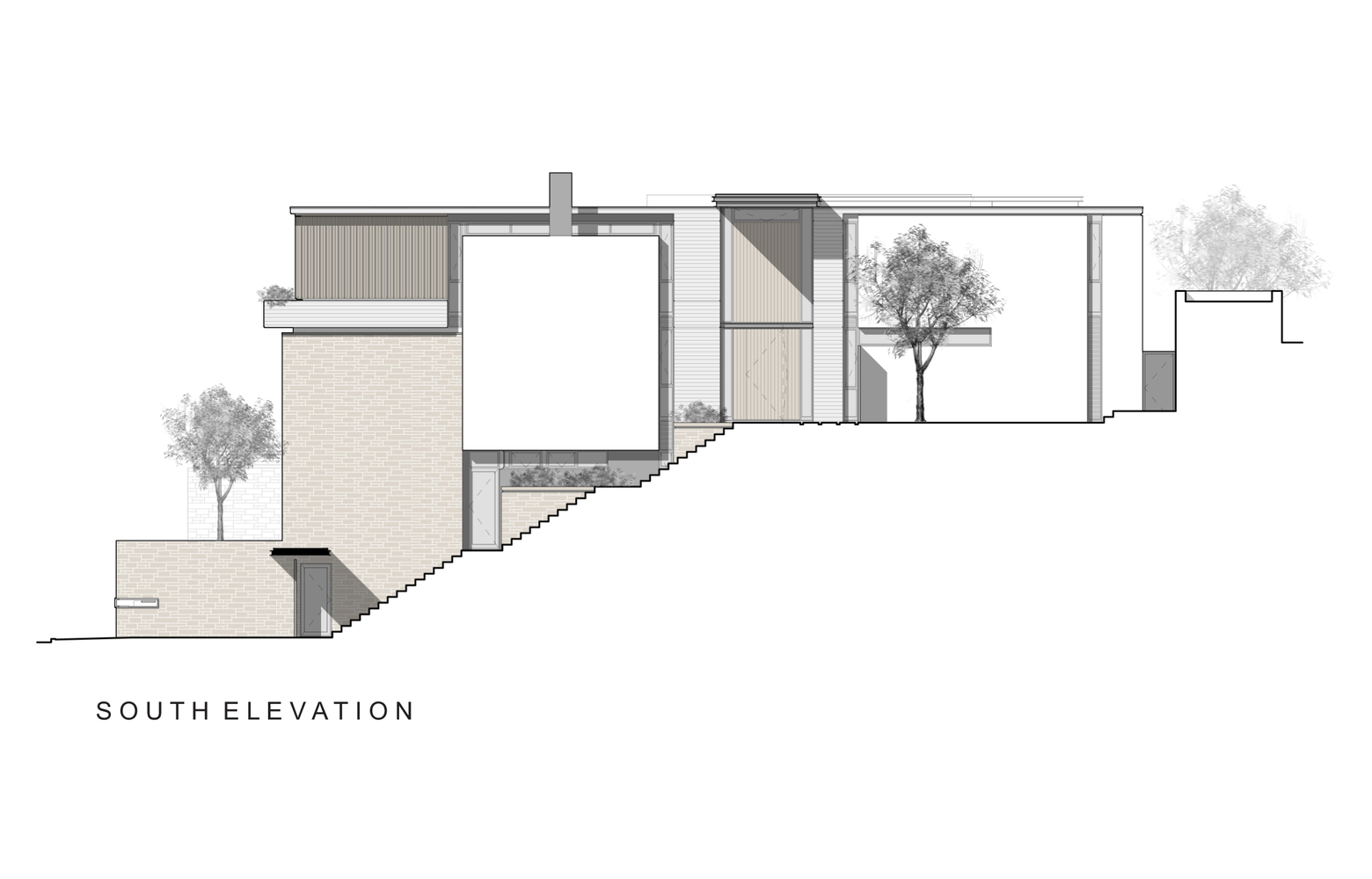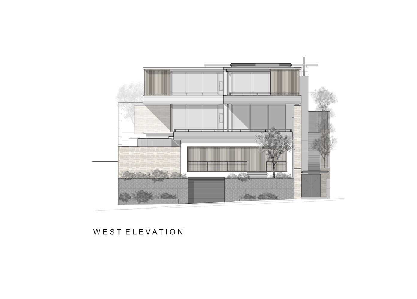 دیوارهای گابیون برای بلند کردن فضاهای نشیمن، بی توجهی به گاراژ بزرگ و ابزارهای صفحه نمایش استفاده می شود. ارتفاع بالاتر از سطح جاده برای به حداکثر رساندن پتانسیل دید ضروری است، اما می تواند منجر به بزرگ شدن توده ساختمان شود. هدف از این طراحی، فرسایش توده ساختمان با استفاده از حجم های کوچک تر و بیان عناصر ساختاری نازک تر مانند دال های کف است و در نتیجه یک انباشتگی ارگانیک از اجزای ساختمان ایجاد می کند.