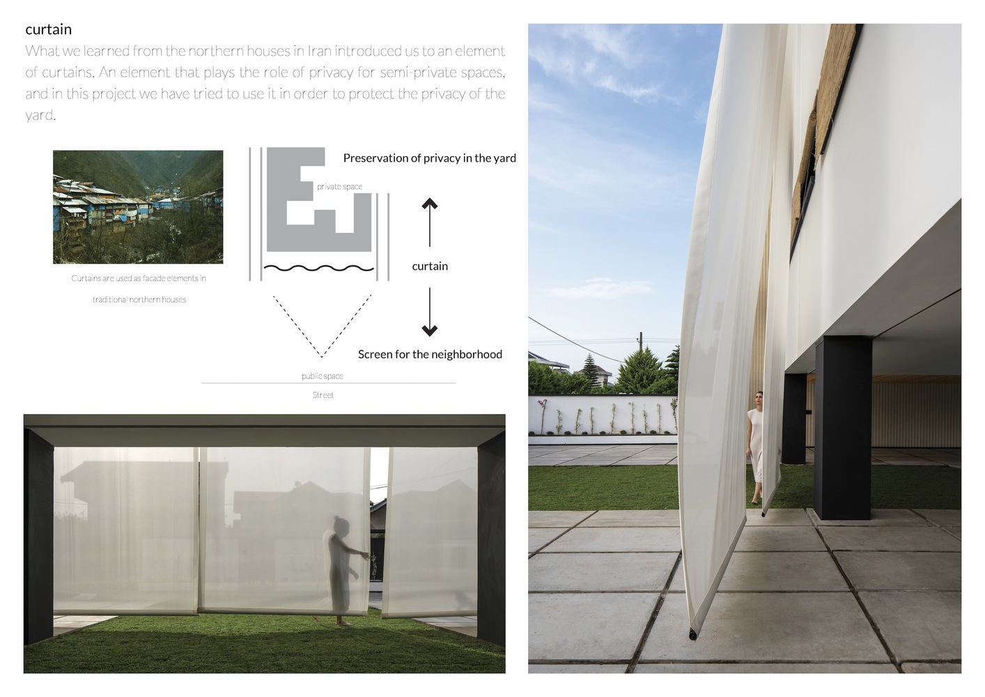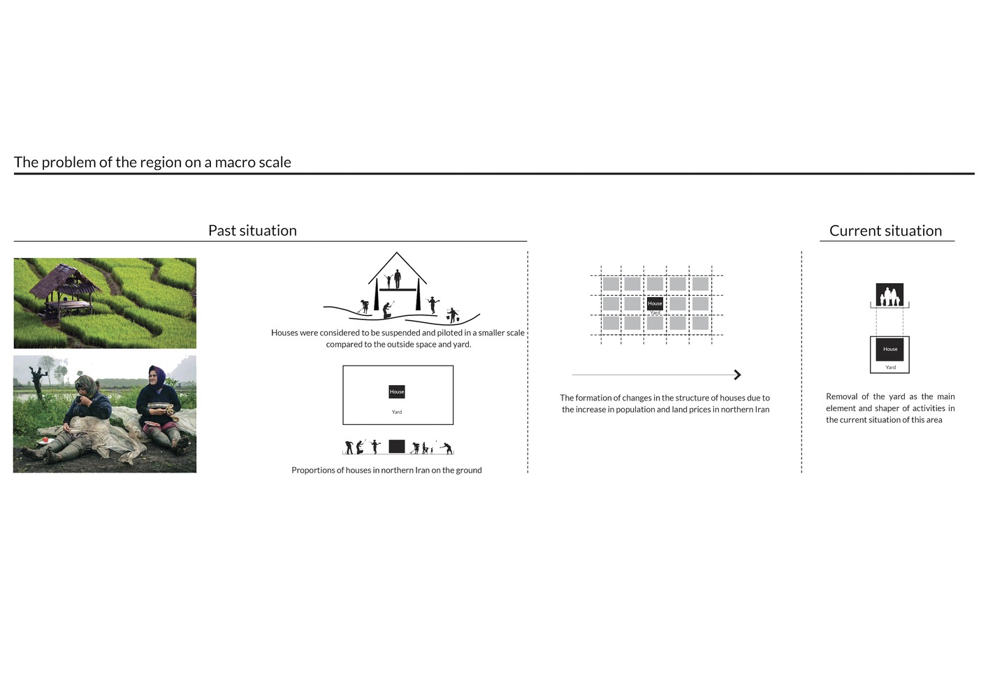 شمال ایران به عنوان منطقه ای سرسبز با زمین های وسیع و حاصلخیز شناخته می شود. در گذشته ساختار شهری این منطقه به گونه ای تعریف می شده که زمین ها دارای تقسیمات نسبتاً بزرگی با عملکرد کشاورزی بودند و خانه ها در ابعاد و نسبت هایی کوچک تر از فضای بیرونی در مرکز این زمین ها قرار داشتند. بنابراین، بخش عمده ای از فعالیت های ساکنان به فضای بیرونی سرازیر می شده است. اما در سال های اخیر ساختار و تقسیم زمین دستخوش تغییراتی شده و به تدریج کوچک شده است.