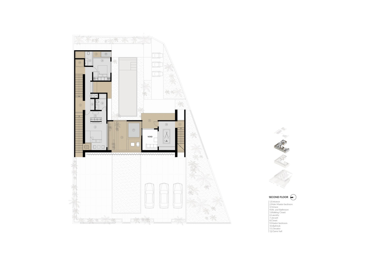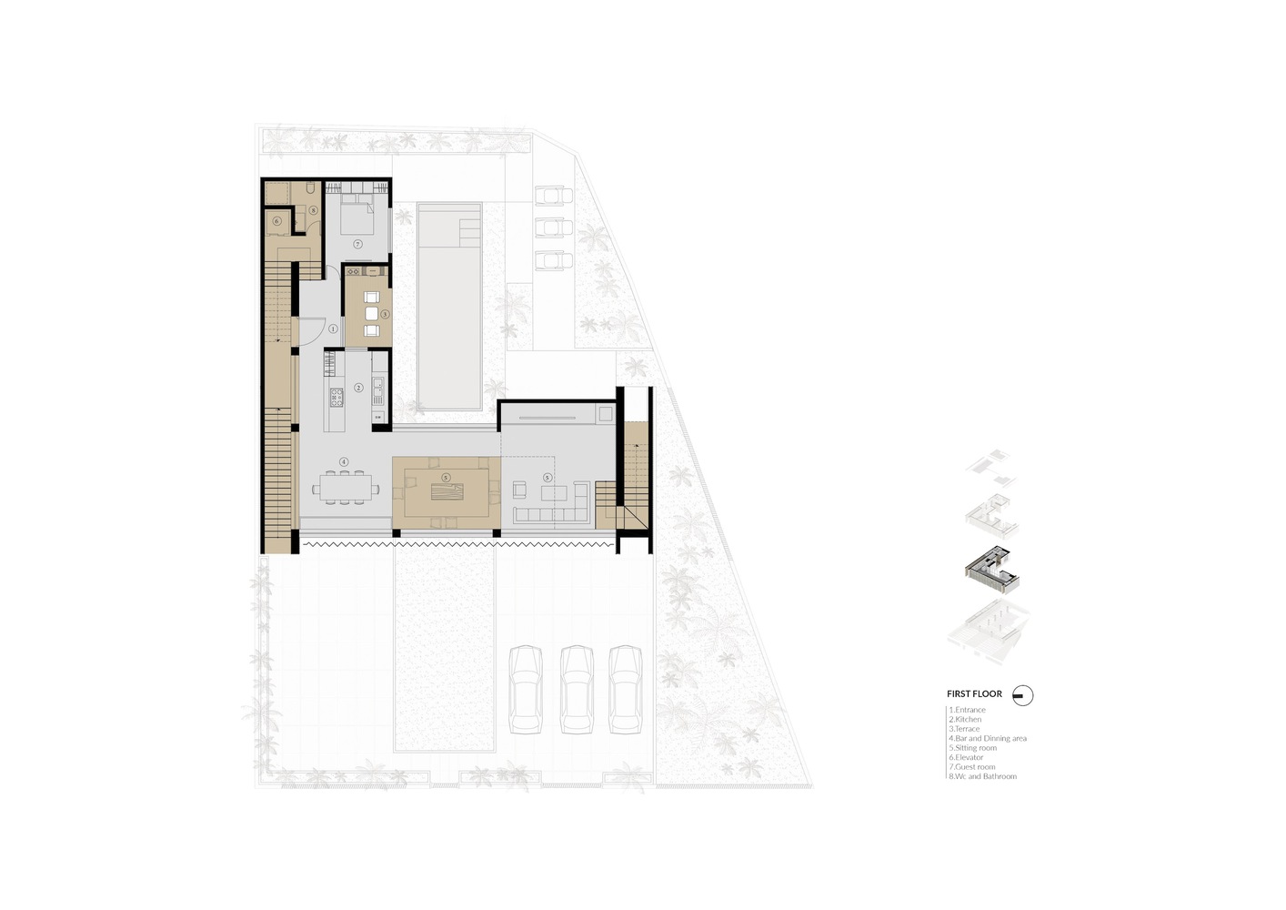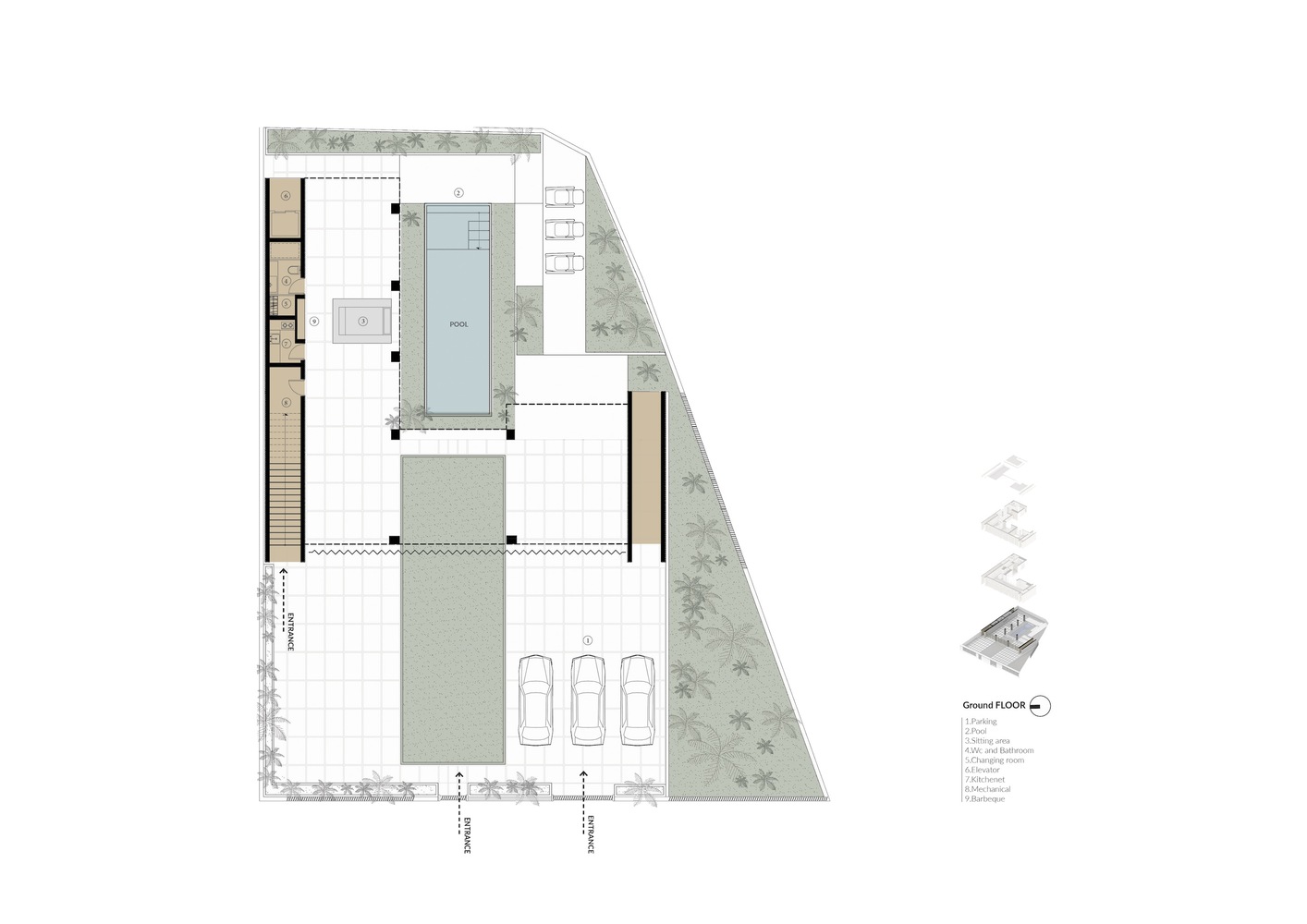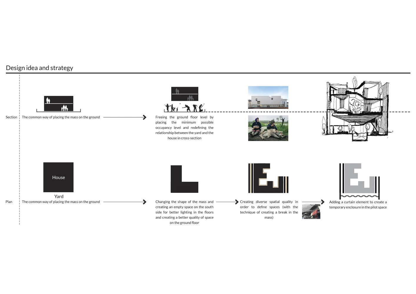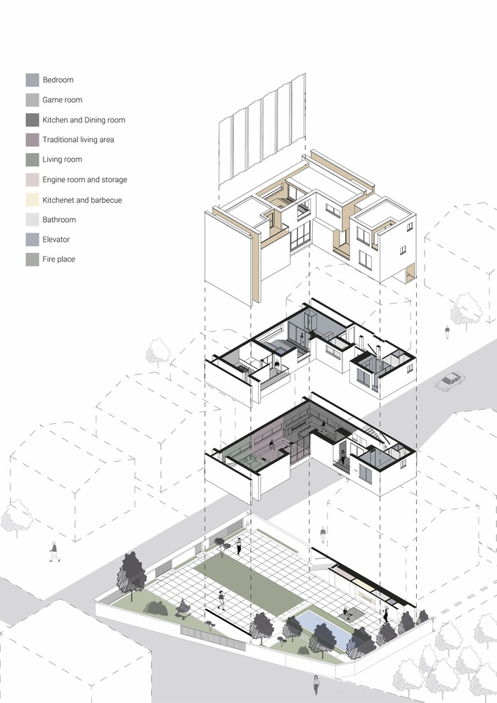 تعریف و شکل گیری توده معلق ساختمان در طبقه همکف با ایجاد کمترین سطح اشغال به منظور حفظ کیفیت فضای حیاط در خدمت ایده اصلی پروژه است. این توده (رو به شهر) به طور رسمی با فرم ساختمان های اطراف هماهنگ می شود و حریم فضای باز با پرده متحرکی فراهم می شود که گاهی کارکرد سنتی خود را حفظ می کند و صفحه بزرگی به شهر می بخشد. از طرفی توده در مقابله با طبیعت برای ورود به نور و ایجاد تنوع فضایی فعال و پویا ناکام مانده است.