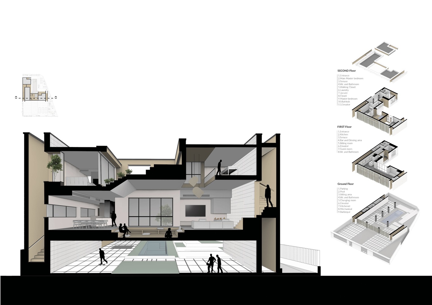 ایده پروژه حفظ طبقه همکف به عنوان بستری برای شکل گیری فعالیت های مختلف در ابعاد کل سایت پروژه است. توده و فضاهای داخلی با اشغال کمترین ردپای ممکن بر روی زمین معلق می شوند و با قرار گرفتن فضای داخلی در سطح بالایی، کل سطح زمین آزادانه مفهوم حیاط را بازتعریف می کند.