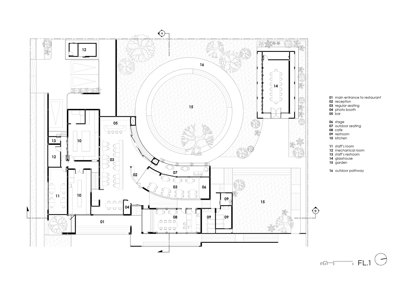 آجر کهنه به عنوان ماده اولیه برای دیوار بیرونی عمل می کند، زیرا دوام و رنگ آن به طور استثنایی آسمان نارنجی رنگ را در هنگام طلوع و غروب خورشید تکمیل می کند و فضای یک رستوران بین فرهنگی را با ظرافتی منتقل می کند. الگوی آجر بیرونی به طور مداوم در فضای داخلی اعمال می شود و با سایر مواد و تزیینات با حالات خوب مخلوط می شود تا حالتی مناسب برای انواع مختلف غذا ایجاد کند و راحتی متقابل فرهنگی را ارائه دهد. هر فضای داخلی از طریق قوس نیم دایره ای که نماد خورشید است، نمایی از منطقه بیرونی ماه نو را ارائه می دهد.