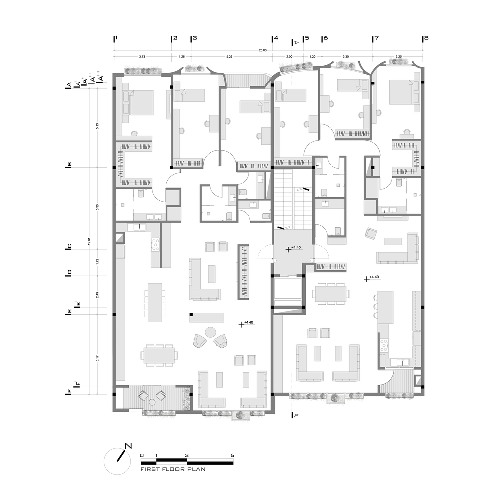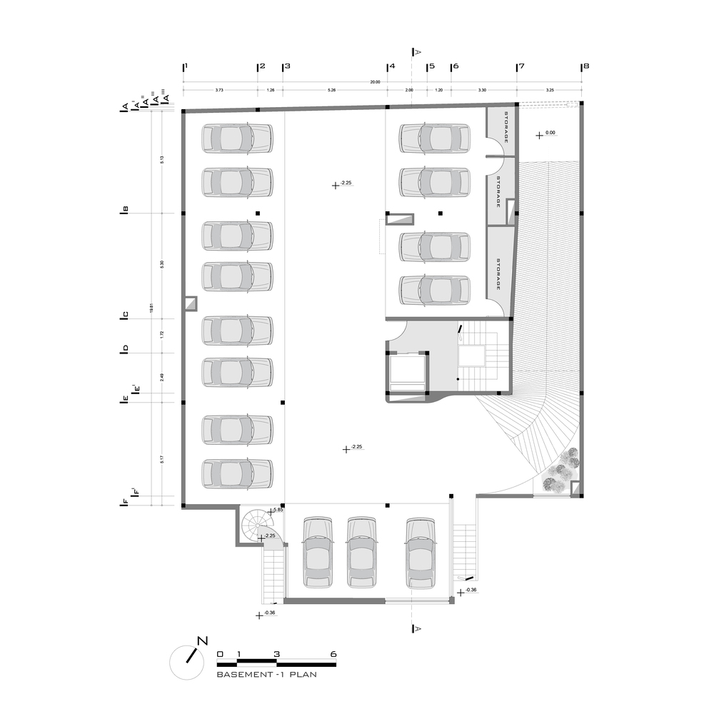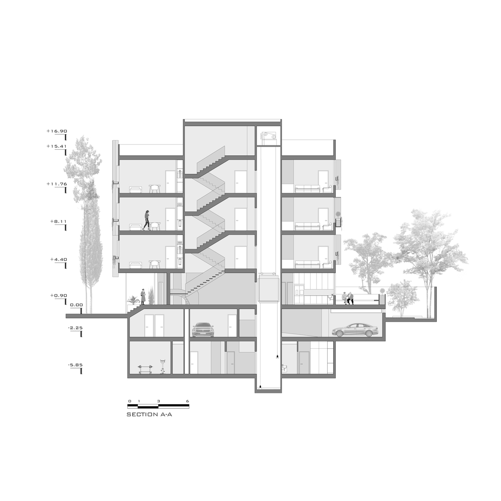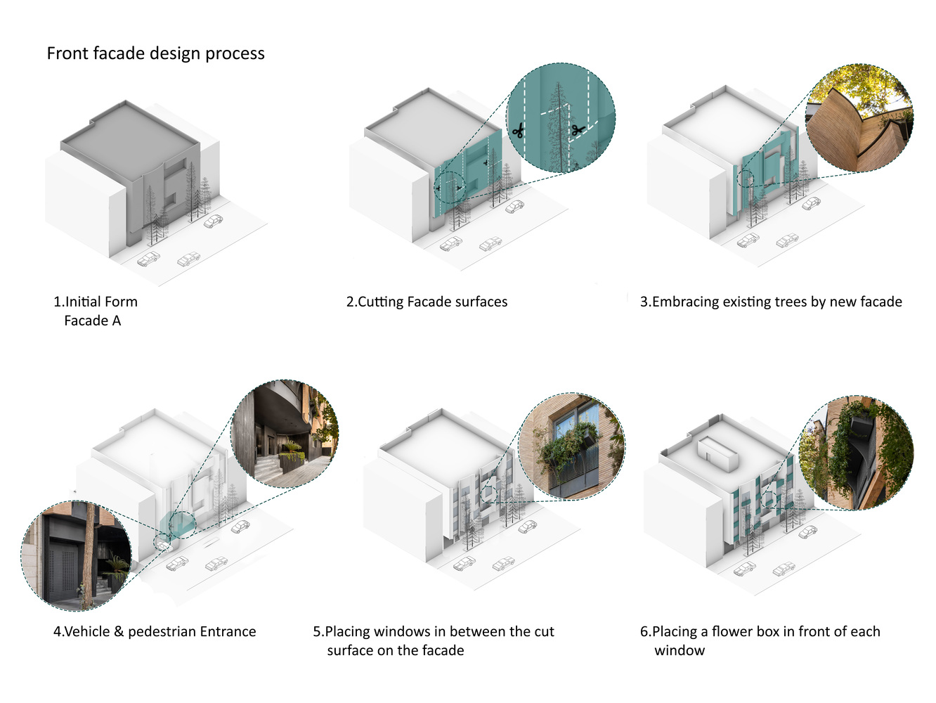 درختان کهنسال روبروی پروژه واقع در مرز بین کوچه و نمای شمال غربی قرار دارد. یکی از دغدغه های اولیه ما اتصال درختان کهنسال به فضای داخلی بود. نما با حفظ درختان موجود شکل خود را به خود گرفت و پانل ها در اطراف درختان حرکت کردند. یکی دیگر از دغدغه های این پروژه ارتباط محیط اطراف ساختمان با فضای محله بود. با حرکت پانل های نما به جلو و عقب، ارتباط بصری مخاطب با پروژه حتی از راه دور ایجاد شد.