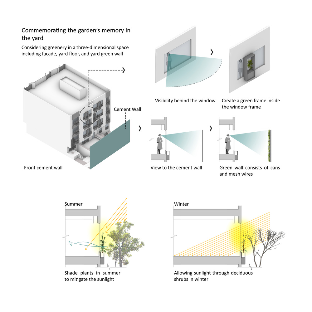 بازدیدکنندگان می توانند فضای سبز را در فضایی سه بعدی تجربه کنند، زیرا پوشش گیاهی از نما شروع به حرکت می کند، از کف حیاط می گذرد و تا دیوار مقابل امتداد می یابد و خاطره باغ های قدیمی را به یاد می آورد. با توجه به چنین ویژگی در این پروژه، قاب هایی جلو پنجره ها طراحی شده تا نمای جلو را قاب بندی کند. تیم طراحی این پروژه امیدوار است که با پرداختن به ارزش های اجتماعی و زیست محیطی در این گونه پروژه ها بتواند بر کیفیت طراحی پروژه های اطراف اثرگذار باشد.
