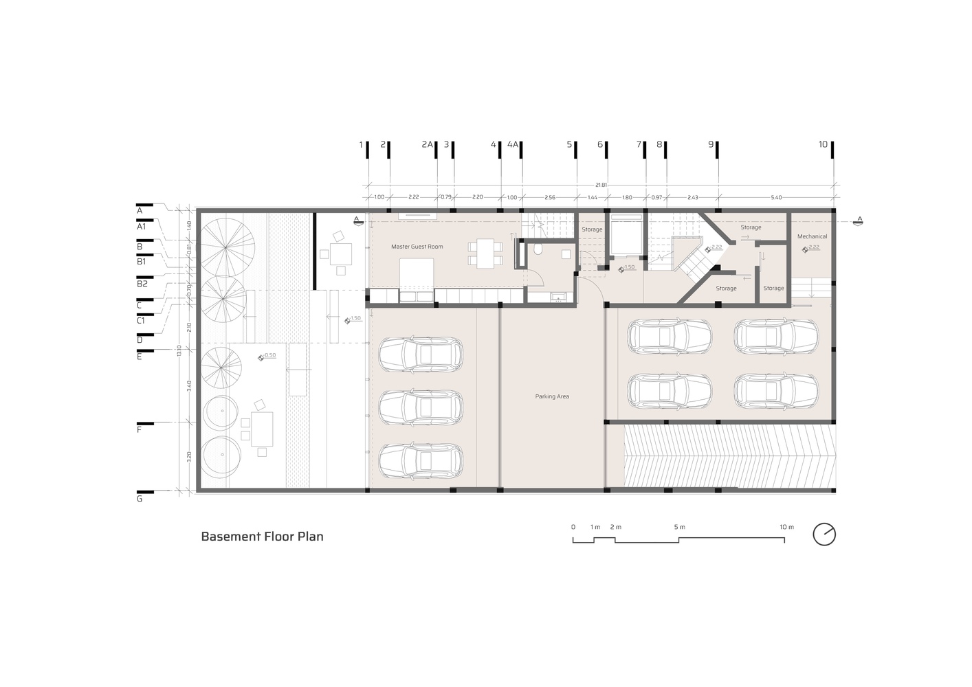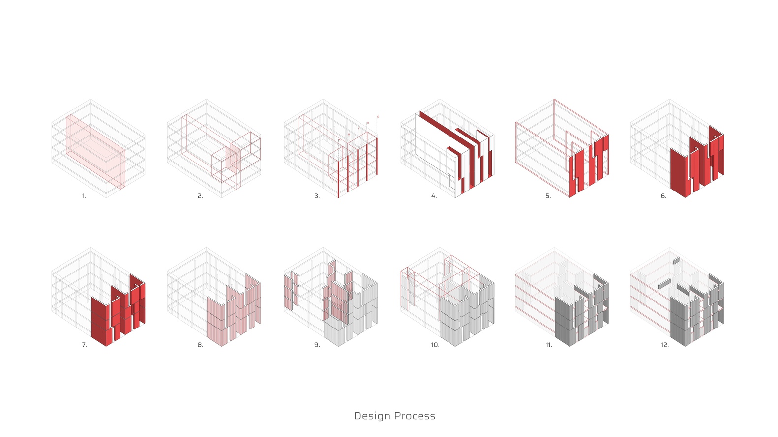 در همین حال، عناصر سازه ای و ستونهای نما در درون این دیوارها پنهان شدهاند. بین این نمای مجزا، نور طبیعی فضاهای داخلی و ارتباط مناسب با صحنه بیرونی محقق میشود. در نهایت، با امتداد این دیوارها به عمق پروژه، چیدمان فضاها و عرصههای داخلی شکل میگیرد.