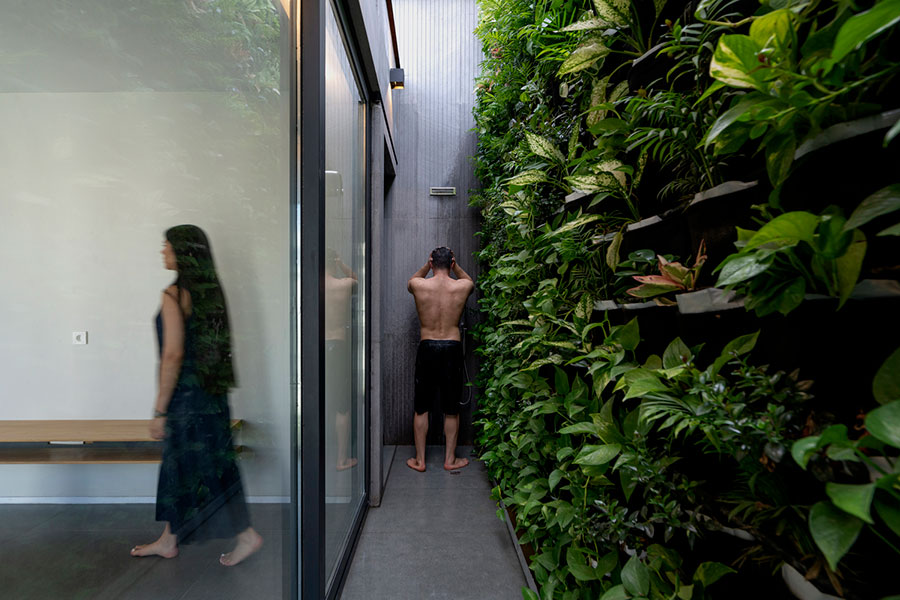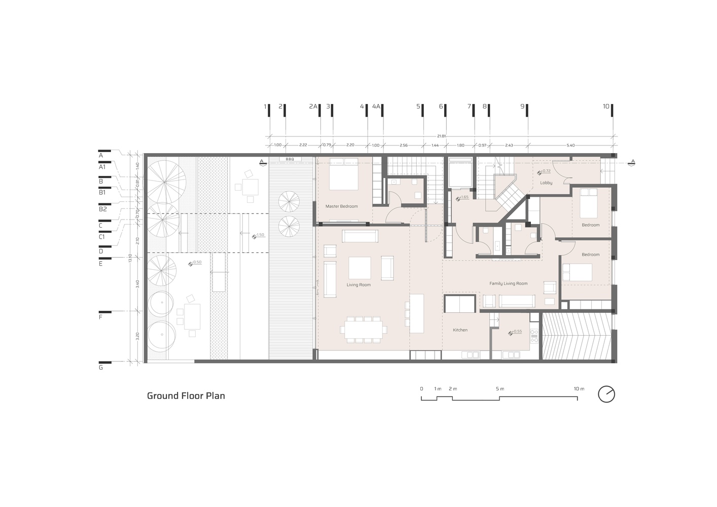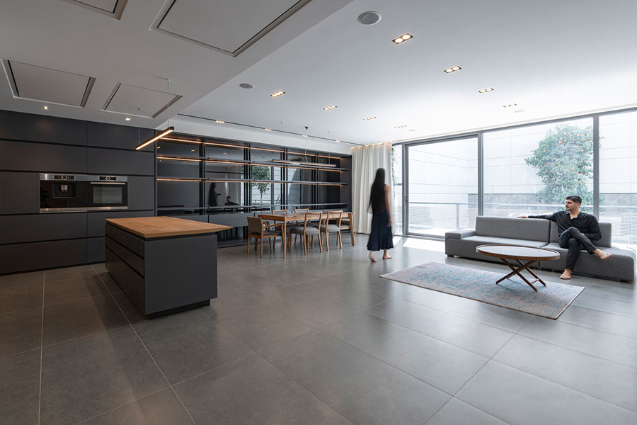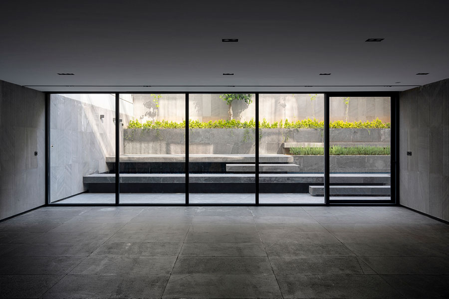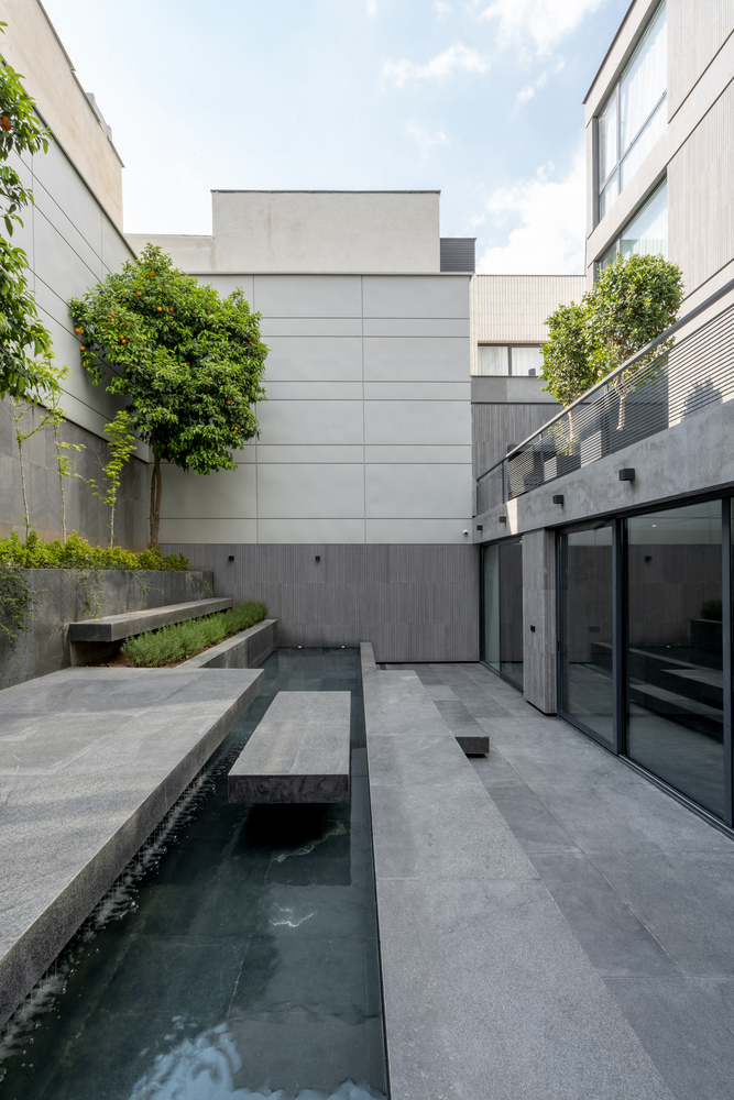 علاوه بر این، یک درختچه در مرکز آن قرار گرفته است تا حس متمایزی را منتقل کند. در امتداد بالکن شمالی و در امتداد محور میانی خانه، اتاق نشیمن و آشپزخانه قرار گرفتهاند. عملکرد و تناسب این فضاها با قطعات دیوارهای بازالتی از سایر عرصههای طرح هماهنگ است.
