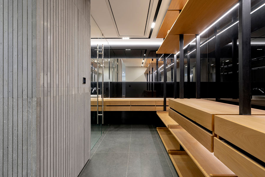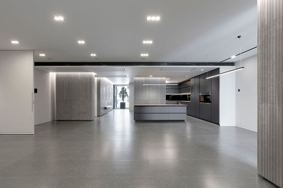 در واقع، جلوههای این دیوارها را میتوان در فضاهای عمومی مانند لابی، پارکینگ، حیاط خلوت، راه پله و روف گاردن مشاهده کرد. علاوه بر این، در هر فضا، طبیعت و استقلال مصالح حفظ شده است. در فضاهای داخلی، مبلمان، مصالح کمدها و کابینتها از چوب نارون ساخته شدهاند تا در کنار رنگ سرد و خنثی سنگ بازالت، فضایی گرم ایجاد شود.