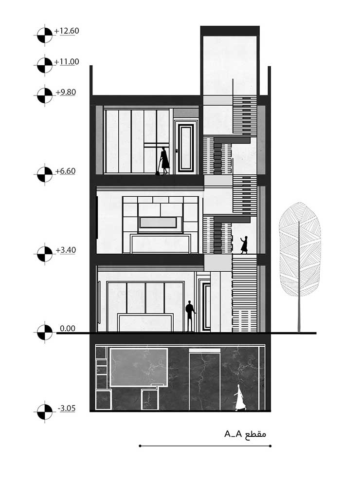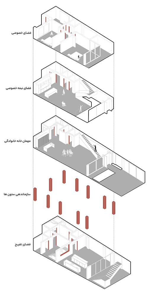 در این پروژه که در زمینی حدود ۱۸۶ مترمربع را شامل می شود، کارفرما جهت طراحی به تیم طراحی PAstudio مراجعه کرده است. خواسته اصلی این خانواده چهار نفره حداکثر استفاده از تراکم زمین بوده است. طوری که بتواند قدرت پاسخ گویی به انتظارات کاربران و استفاده کنندگان را داشته باشد. این پروژه نقش مهمی در ارتباط و اتصال اعضای خانواده که از دو نسل و دو نگرش و خواسته هایی متفاوت و حتی تا حدودی دور می باشند و در یک خانه زندگی می کنند را دارد.