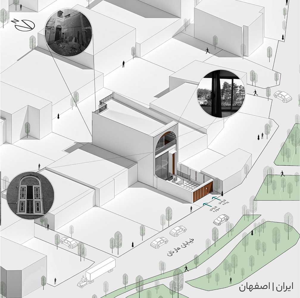 با توجه به این که این پروژه در محله مارنان اصفهان که نزدیک به جلفا، کلیساهای تاریخی و محله ارامنه نشین قرار گرفته است، می توان گفت مهم ترین عامل تاثیرگذار در این بستر، بافت قدیمی به همراه خانه هایی است برگرفته از معماری گذشته اصفهان که نشان از گذشته زیبای این منطقه دارد.