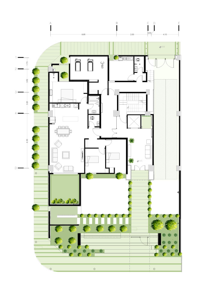 د- یک واحد مسکونی در طبقهی همکف ساختمان تعریف شده بود، که کیفیت آن به دلیل مجاورت با حیاط عمومی و عبور مخاطب پیاده از کنار پنجرههایش، کاهش پیدا میکرد، راهکار این مسئله را در تعریف حیاط خصوصی برای واحد همکف که از طریق گودال باغچه از عرصهی عمومی تفکیک شده است، یافتیم.