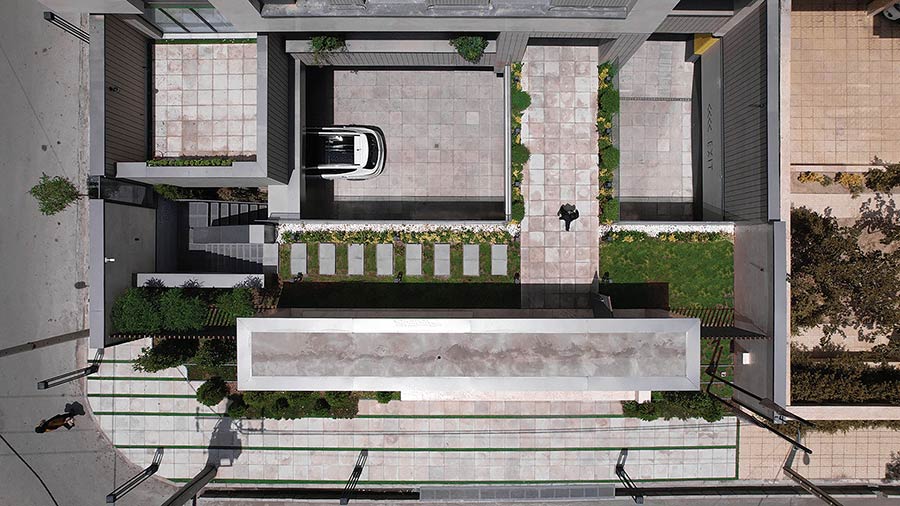 ج- با طراحی پلی سبز از میان گودال باغچه، گذار ورودی را از پلازای شهری به درون بنا تعریف کردیم.