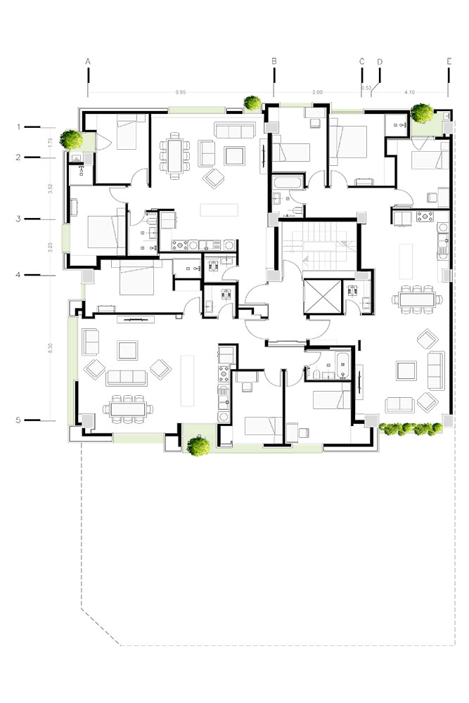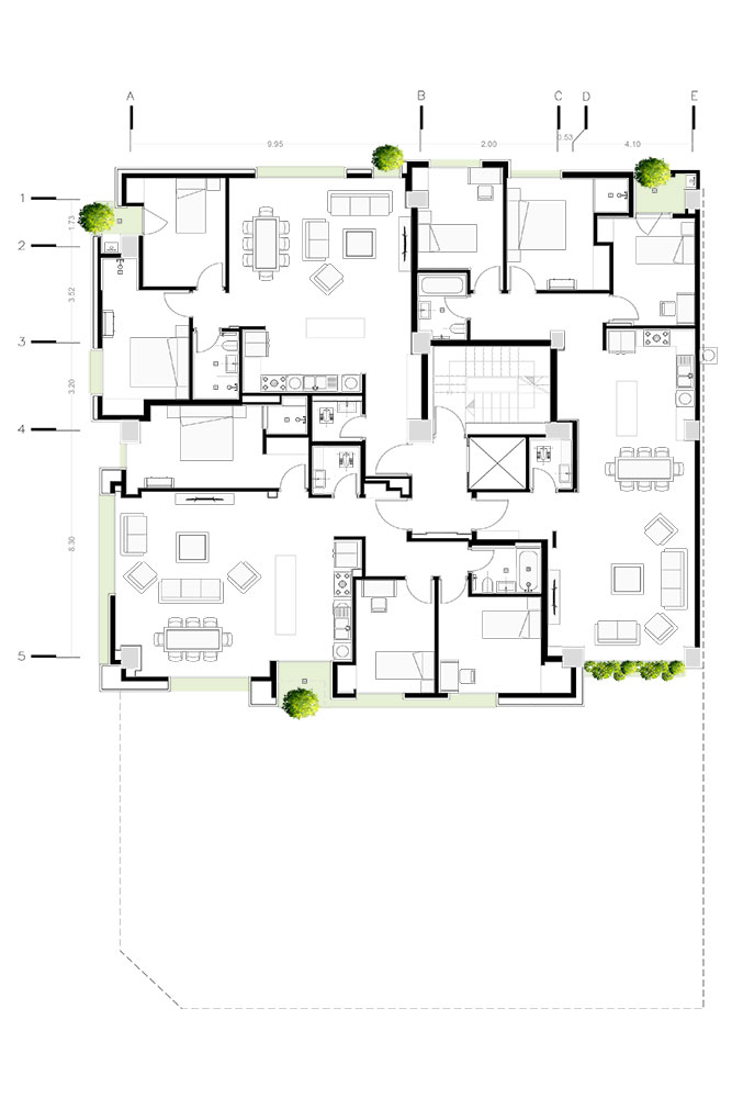 و- واحدهای طبقهی پایانی (طبقهی ششم) را با الگوی حیاط مرکزی طراحی کردیم، این حیاطها به عنوان قلب تپندهی خانه، علاوه بر افزایش سبزینگی، نور و آفتاب، محل دورهم جمع شدن خانواده بوده و سهمی از آسمان را بار دیگر به خانههای امروزی هدیه میدهند.