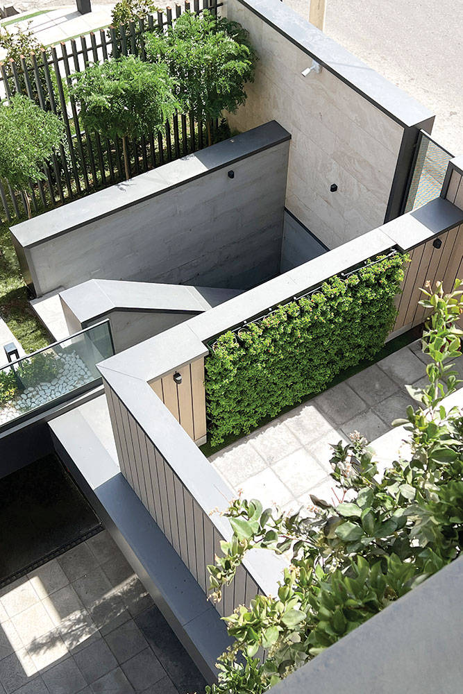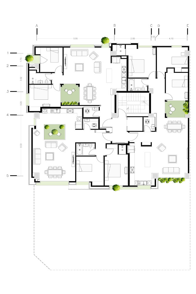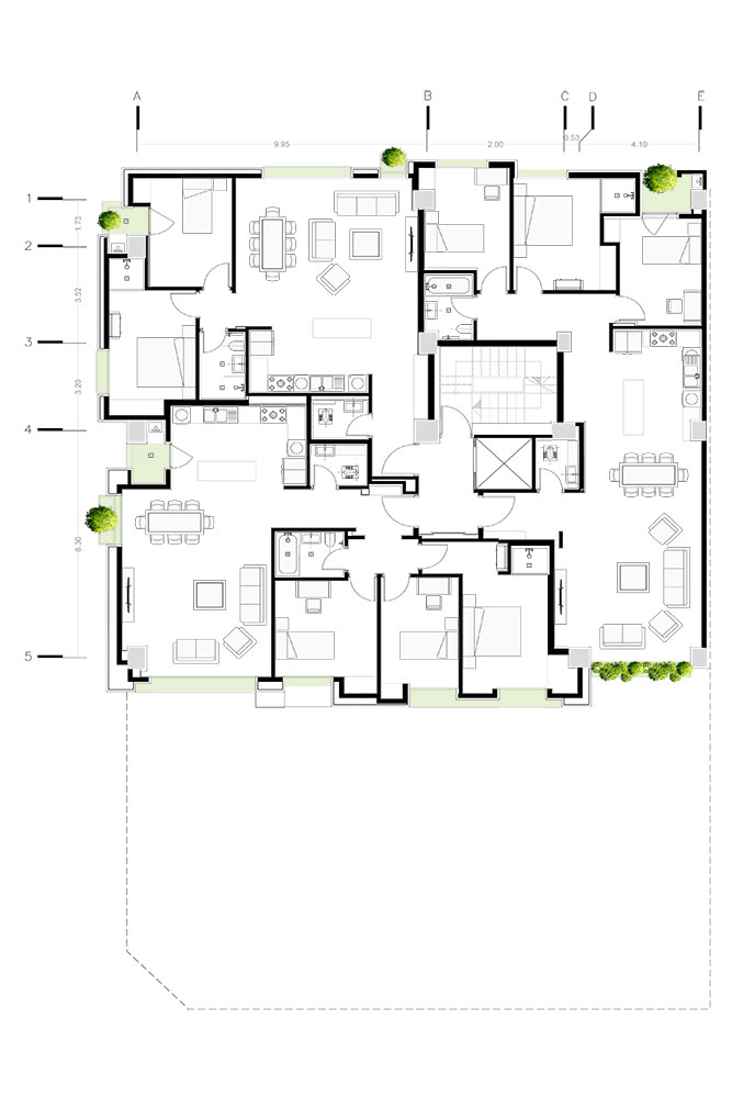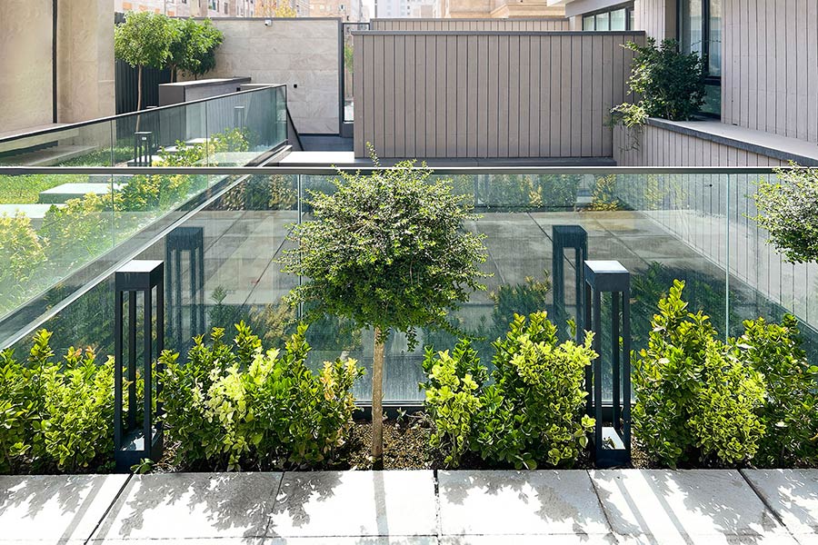 ه- با گسترش فضای سبز به حوزهی میانی (حد فاصل تراز پایه و طبقهی پایانی) حس زندگی را به درون خانهها تزریق کردیم.