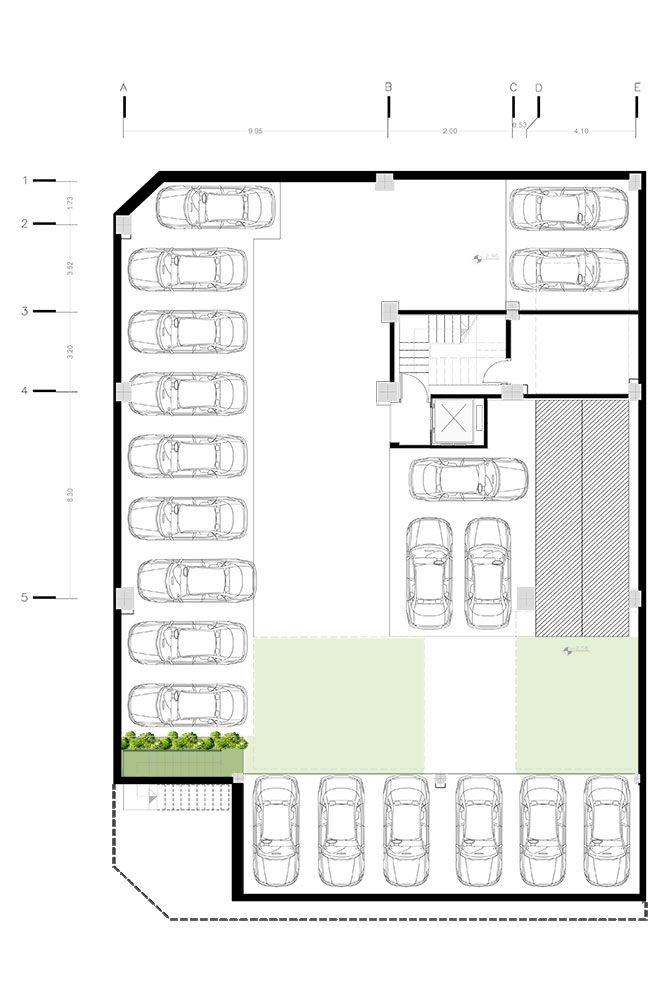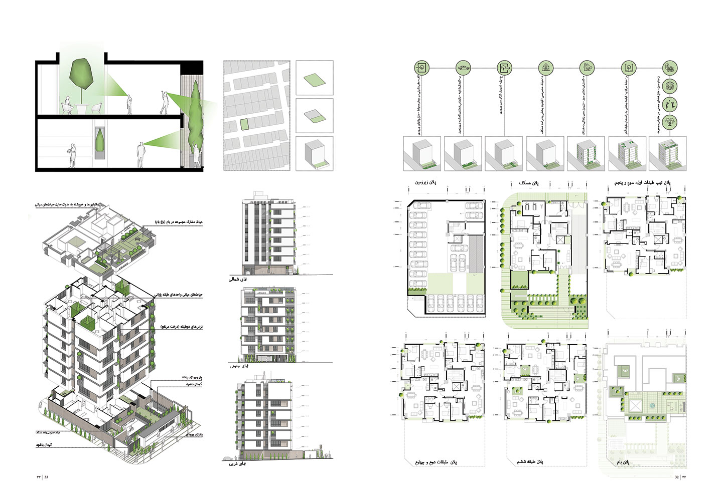 ز- گفتیم این فضای باز باقیمانده که قرار بود نقش حیاط خانه را ایفا کند و ساکنان خانه را درون خود دور هم جمع کند، این نقش بنیادی را در ساختار ضابطهی جرمگذاری از دست داده است. برای احیای این نقش، به بام که از فضای عمومی شهری و دسترسیها در تراز پایه فاصله گرفته و امکان خلق حیاط نیمهعمومی آرام را دارد، پناه بردیم و بام سبز را، شامل فضاهای نشیمن سبز، آلاچیق، فضای بازی کودکان و حوض آب طراحی کردیم.