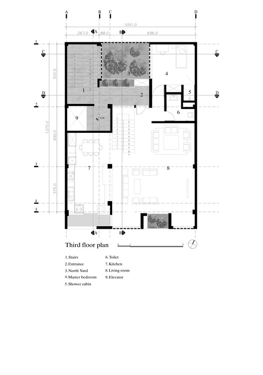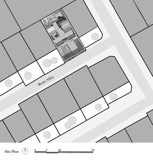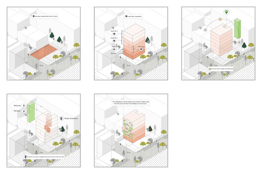 در سه طبقه اول، دو واحد دوبلکس طراحی شده است و دو طبقه آخر به والدین اختصاص داده شده است، بنابراین یک فضای محله مشترک ضروری بود. در این میان کوچه جنوبی عریض نبود و قادر به ارائه منظره ای دیدنی نبود که منجر به شکل گیری مهمترین تصمیم معماری پروژه شد: ایجاد خانه های درونگرا در مجاورت یکدیگر با ارتباط قوی با حیاط شمالی.