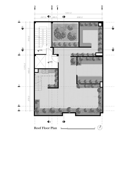 ورودی اصلی واحد والدین از طبقه چهارم می باشد که دارای اتاق مهمان، سالن و آشپزخانه می باشد. در طبقه آخر، سه اتاق، حمام، سرویس بهداشتی، خشکشویی و اتاق نشیمن اصلی که تمام خانواده در آن جمع می شوند، رو به حیاط داخلی قرار دارد. حجم هر واحد دوبلکس نشانگر و مجزا از واحد مجاور در نمای جنوبی است. پوسته مشبک خاکستری خشن بیرونی ترین قسمت نما است. پوست حیاط داخلی شامل پنجره ها و رنگ و بافت صمیمی آجر بر درون گرا بودن خانه ها تاکید دارد.