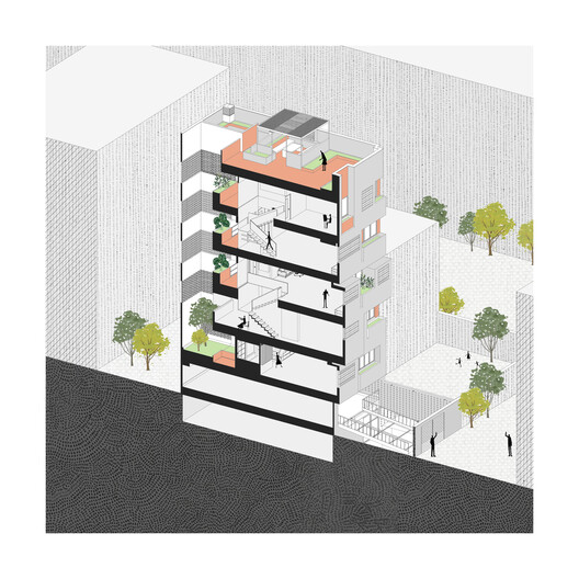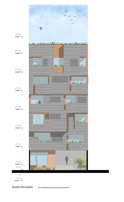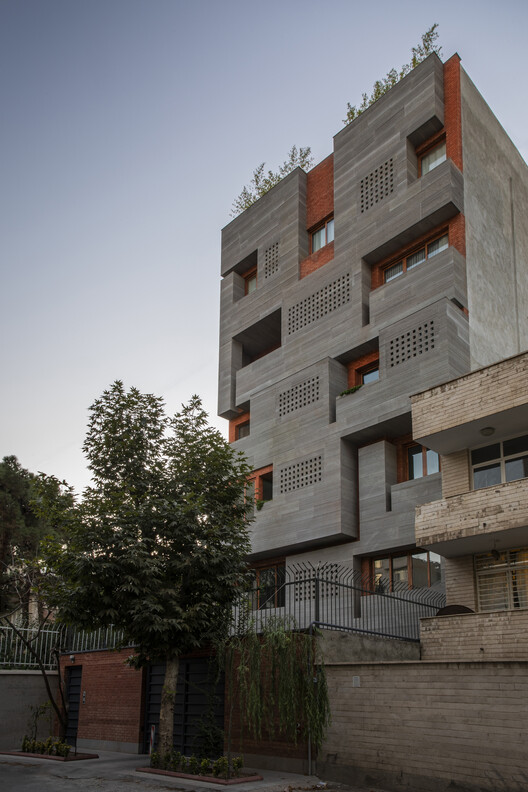 پروژه رو به یک فضای محله مشترک است که از دید کوچه جنوبی پنهان است، یعنی واحدها فقط برای بهره مندی از نور جنوبی از ضلع جنوبی استفاده می کنند اما از نظر کیفی به سمت حیاط داخلی رفته اند که بیشتر امکانات را ارائه می دهد. نمایی از فضاهای داخلی یک دیوار مشبک آجری بین حیاط و راه پله قرار دارد و ورودی نیمه باز هر طبقه باعث می شود این حیاط داخلی به راحتی برای همه سطوح قابل دسترسی باشد.