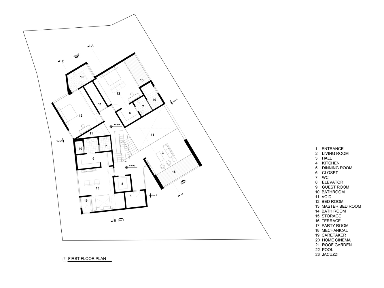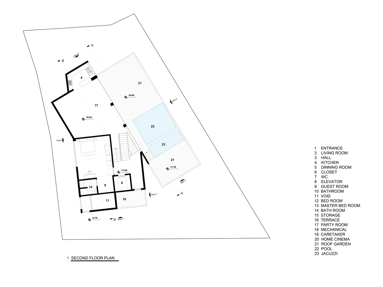 • ثانیاً، در این پروژه، کارفرما فضاهایی مانند چهار اتاق خواب مستر، سالن و اتاق نشیمن اختصاصی، آشپزخانه و همچنین سالن در اتاق خواب مجزا برای مهمانی ها، اتاق تماشای فیلم، اتاق سرایداری، اتاق رختشویی و پارکینگ برای ماشین ها. همچنین ایجاد استخر روباز و فضای سبز قابل قبول از دیگر درخواست های کارفرما بود.