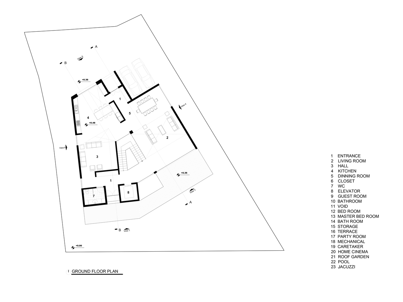 • اول موقعیت مکانی و موقعیت هندسی سایت بوده است. بر خلاف سایت های معمولی، این قطعه از چهار طرف توسط همسایگان احاطه شده است. تنها راه دسترسی آن به معبر اصلی دو کوچه به عرض ۳ متر در شمال و جنوب آن است. هندسه نامنظم سایت و زوایای ناهمگون همسایه ها نسبت به سایت از جمله موارد پیش رو در طراحی این بنا بوده است.