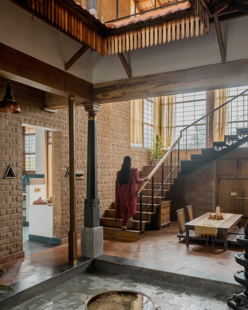 خانه به طور یکپارچه عناصر سنتی را با عملکرد مدرن ادغام می کند و محیطی پایدار را ایجاد می کند که ارتباط و قدردانی از طبیعت را تشویق می کند. ستون های سنگی در حیاط، سبکی ماندگار را ارائه می دهند، در حالی که برآمدگی های کاشی Mangalore سایه و جذابیت بی انتها را ارائه می دهند. دهانه های بزرگ در ضلع شرقی منطقه نشیمن به طور پیوسته با فضای نشسته ارتباط دارند و مرزهای بین زندگی داخلی و خارجی را محو می کنند. اتصال بصری یک اولویت در سراسر طراحی باقی می ماند، با حیاطی به عنوان مرکزی که به تمام فضاهای زندگی دیگر می پیوندد.