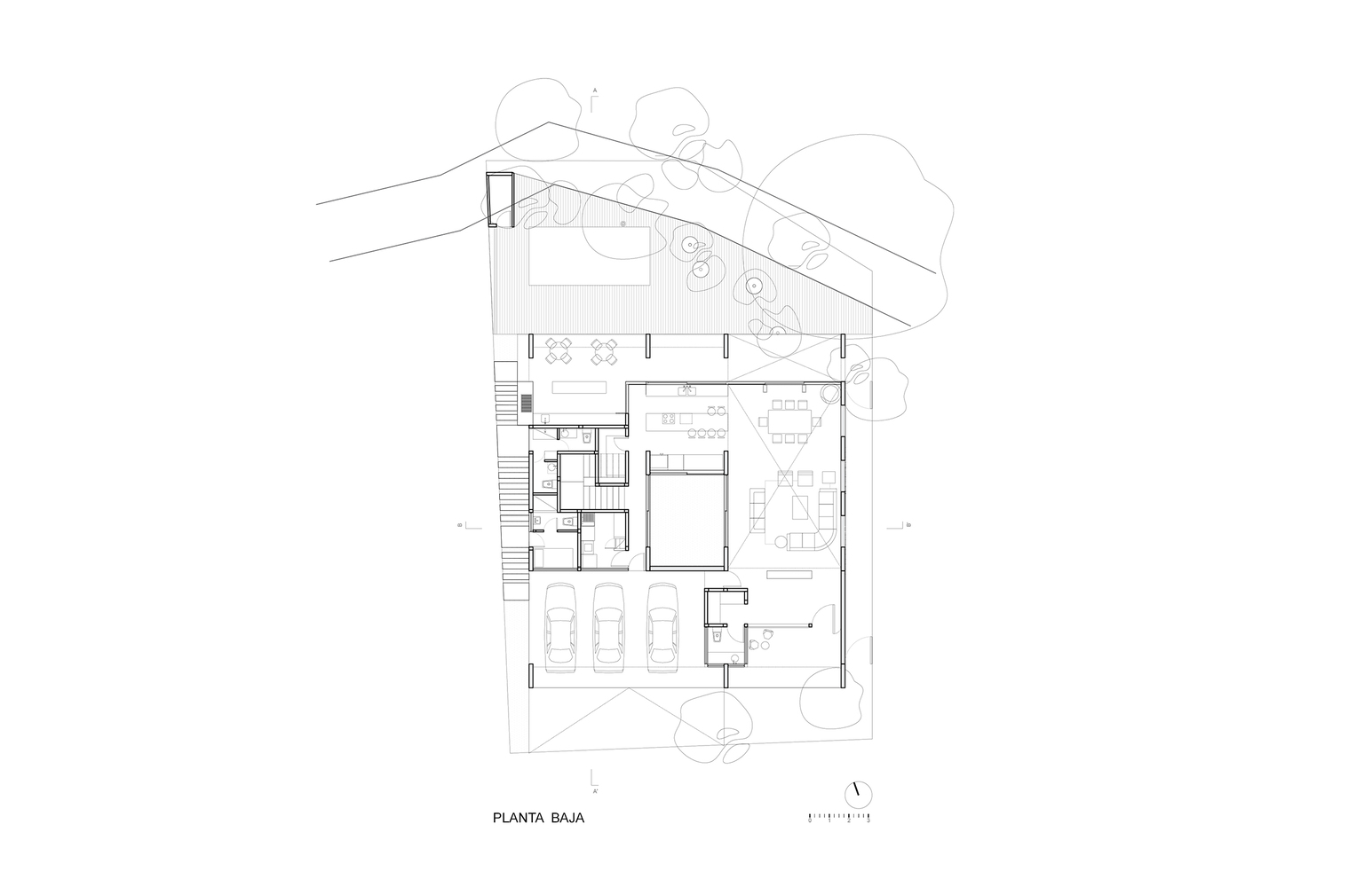 از آنجایی که طولانی است، ما یک حیاط مرکزی را پیشنهاد می کنیم که به روشنایی و تهویه هر فضا کمک می کند. این عنصر میانی یک انباشته است که در آن سقف های شیبدار همگرا می شوند. تفاوت ارتفاع بین مرکز و لبه های خانه، سازماندهی فضاها را تعیین می کند. قسمت های نشیمن به طرفین با ارتفاعات تک، دوتایی و سه گانه هستند، در حالی که مناطق خدماتی به منطقه مرکزی نزدیکتر هستند که خانه فقط دو سطح را مجاز می کند. حداکثر ارتفاع در نمای بیرونی ساختمان به گونه ای تنظیم می شود که از ارتفاع خانه های همسایه پیروی کند.