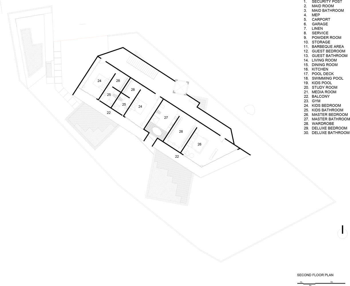 مطالعه توده ساختمانی با بلوک‌ های جرمی انجام می‌ شود که انباشته شده و مرتب شده‌ اند تا ترکیبی از توده‌ های ساختمانی مرتبط و متقابل را تشکیل دهند. با استفاده از جرم استخر به عنوان نقطه مرجع، دو توده ساختمانی بالای آن جهت استخر را دنبال می‌ کنند، به جز جرم ساختمان در طبقه دوم که برای ایجاد فضایی برای یک منطقه آرام‌ تر/مدیتیشن عبور می‌ کند. در بخش شمالی، که منطقه شفا است، معبد کوچکی برای نماز و همچنین منطقه ای برای تناسب اندام یا یوگا وجود دارد.
