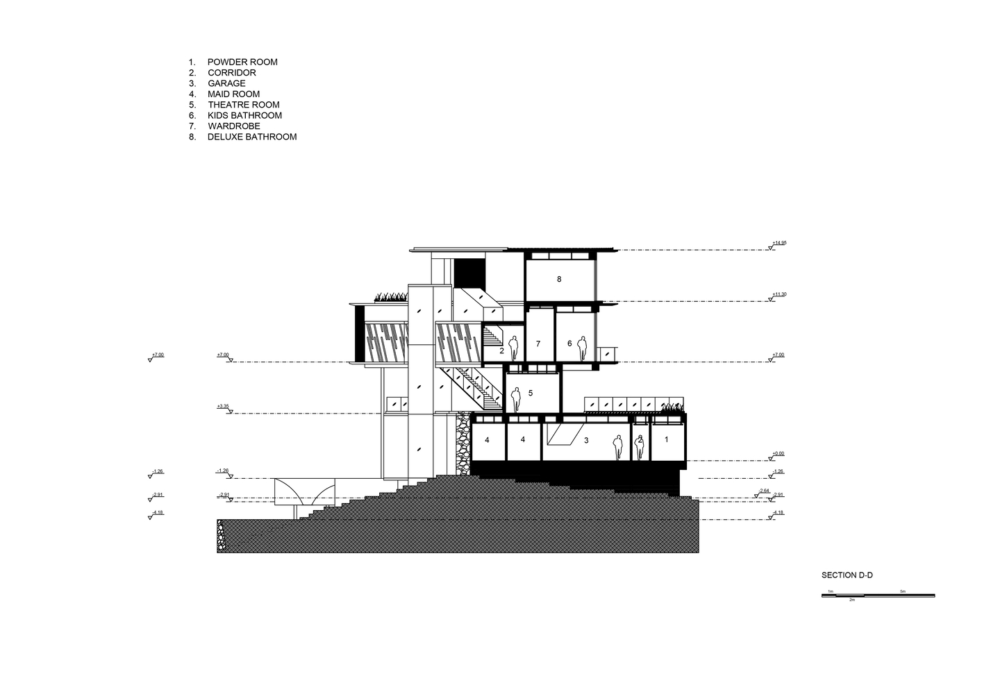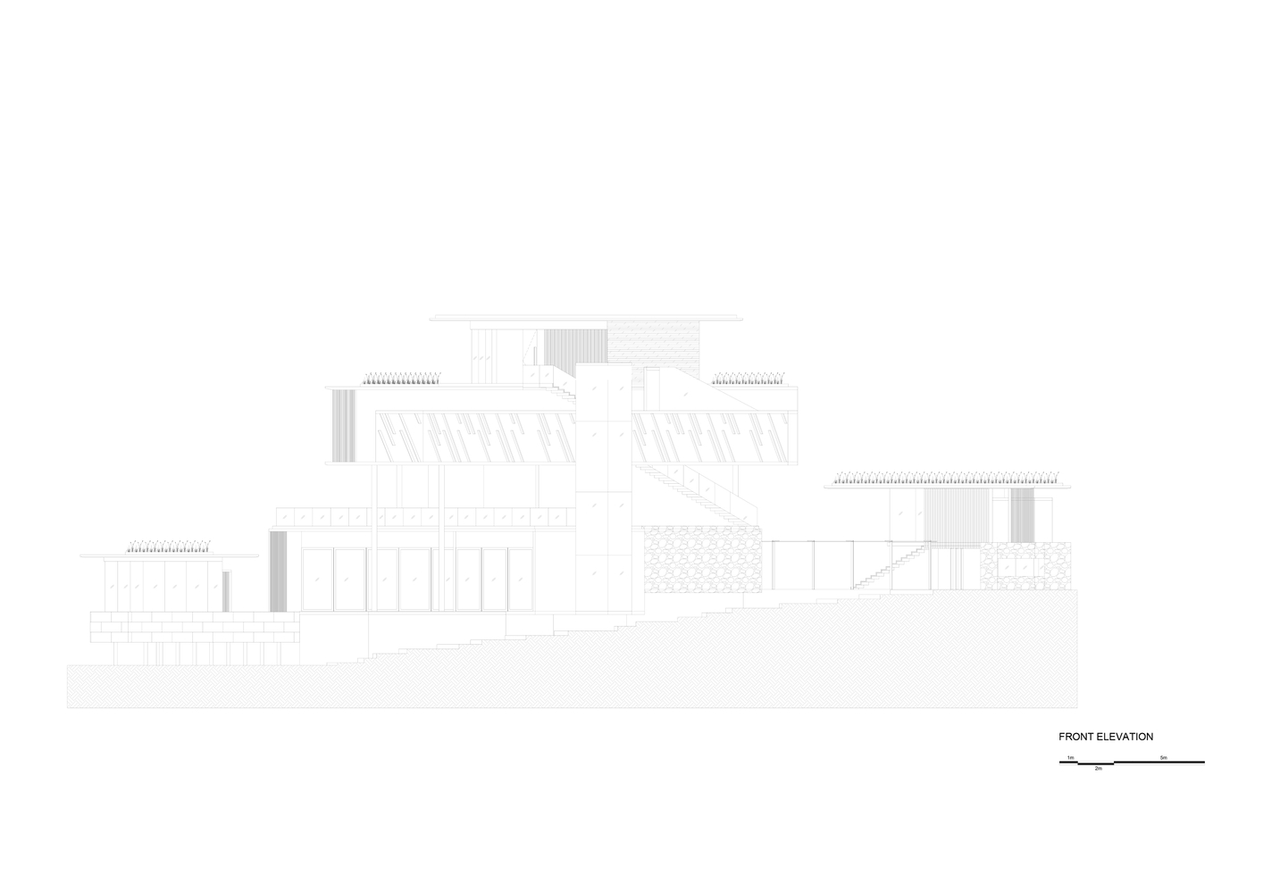 انبوه ساختمان مقابل شامل قسمت خدمات، آشپزخانه و پارکینگ است. حیاط که برای باربیکیو استفاده می شود در وسط قرار دارد و پس از آن قسمت نشیمن و غذاخوری و اتاق مهمان قرار دارد. در بالاترین سطح، یک پنت هاوس وجود دارد که از سه اتاق با راهروهایی تشکیل شده است که نور خورشید را به حداکثر می رساند. بین طبقات اول و دوم، یک نیم طبقه با یک فضای سرگرمی برای تماشای فیلم و یک بار وجود دارد که توسط یک محوطه بیرونی با منظره دریا یا غروب خورشید پشتیبانی می شود.
