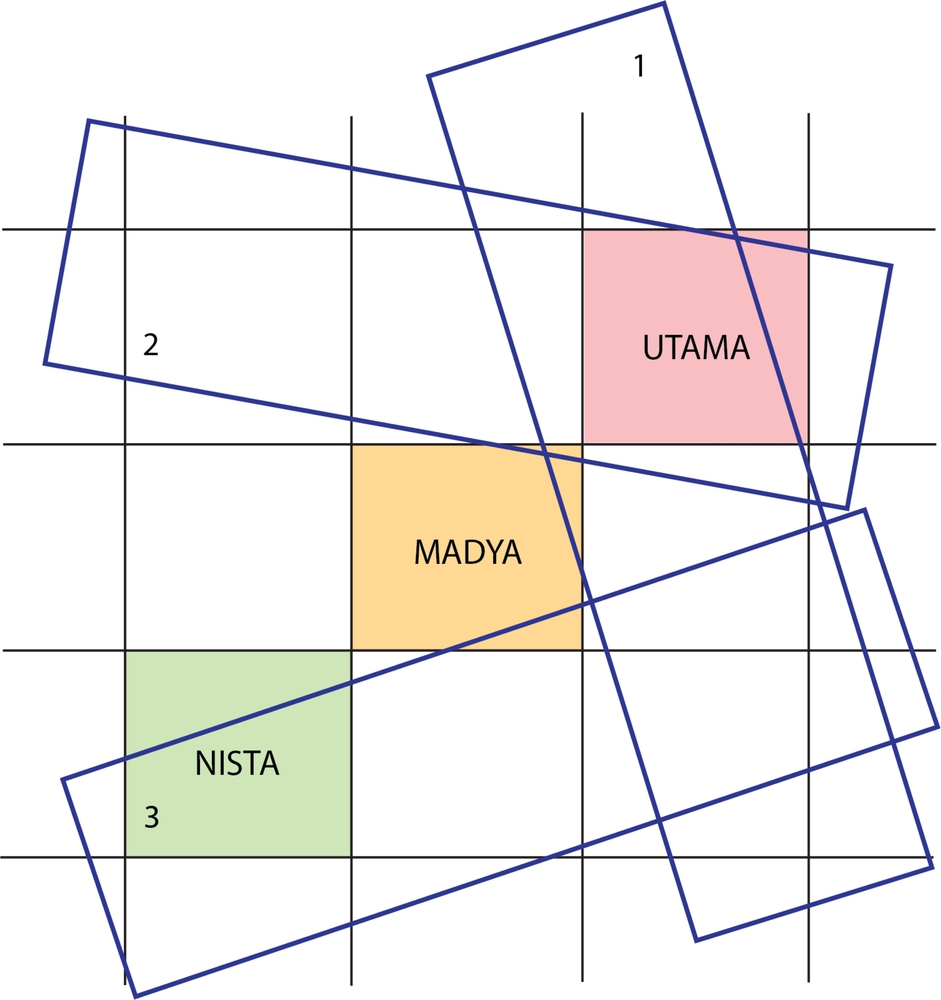 مفهوم نهایی madhyama kanista است که به طور سنتی پایدار است، اما در این مفهوم به عنوان منظره ای تفسیر می شود که از کل پشتیبانی می کند و به صورت برنامه ای به عنوان فضایی برای سرگرمی ها و تفریحات قرار می گیرد. در حالی که مفهوم سه آنگا یک تقسیم سه بعدی مجازی به صورت عمودی است، یعنی آنگا یا سقف اصلی، بزرگیاما آنگا ساختمانی است متشکل از ستون ها و دیوارها، و کانیستا آنگا پایه و محل ذخیره آب است، بیشتر فونداسیون آن است. توسط ستون ها پشتیبانی می شود به طوری که تقریباً تمام ساختمان های رو به عقب از سطح زمین بلند شده اند.