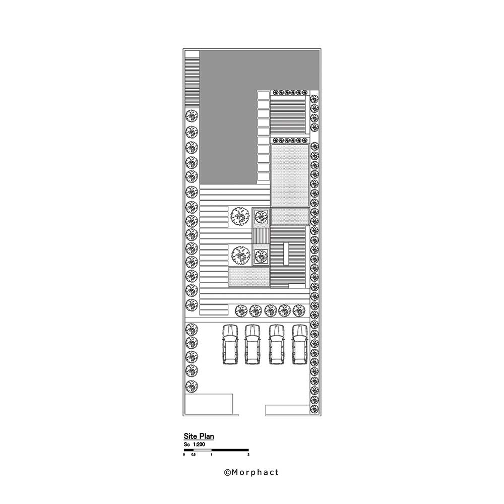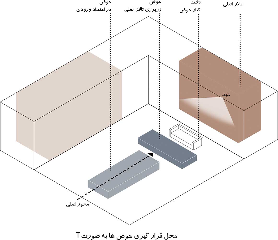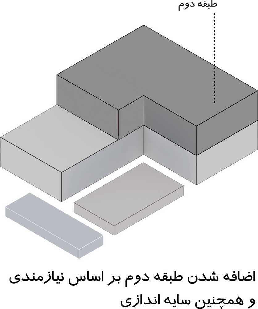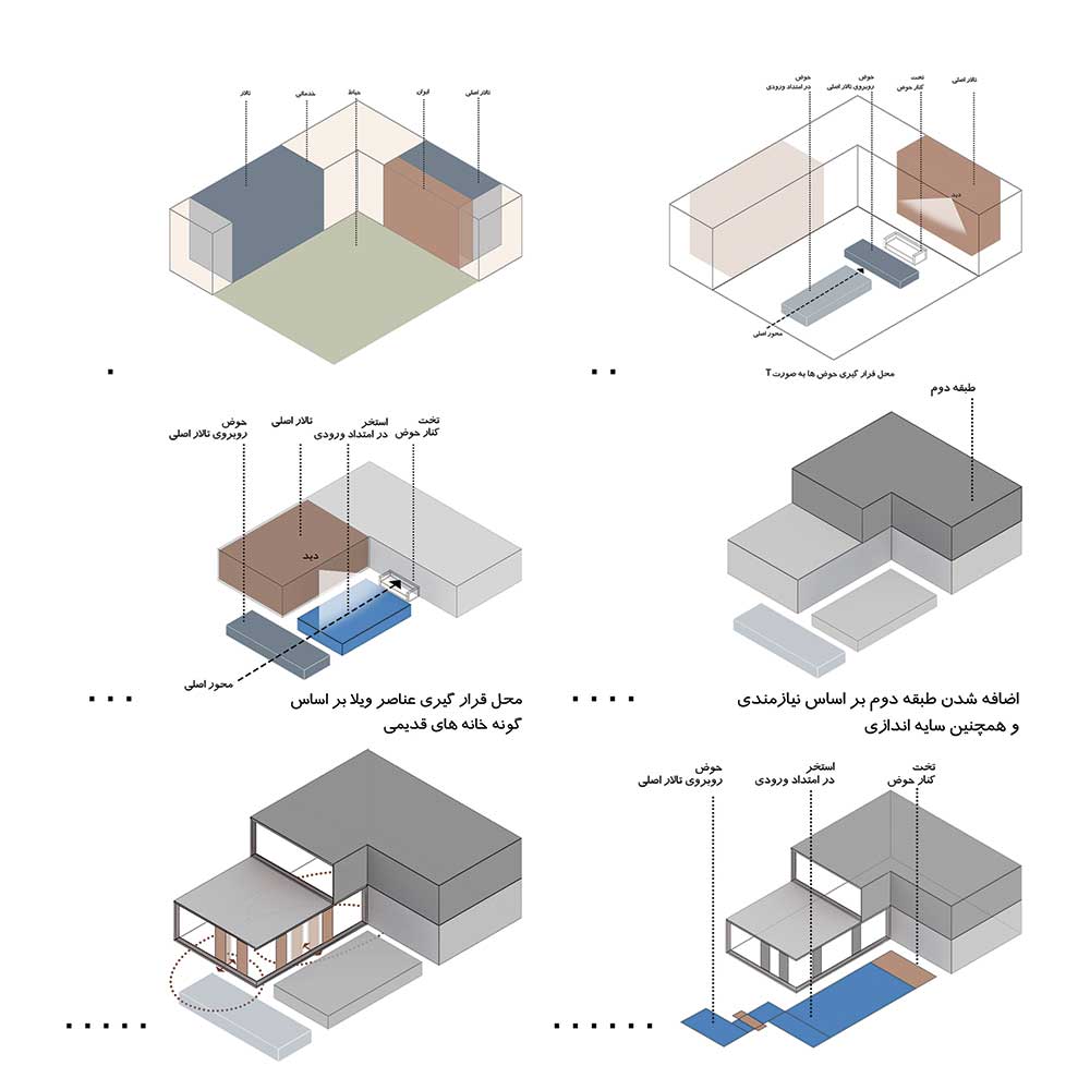 در روند طراحی این پروژه که برگرفته از الگوی خانه ایرانی می‌باشد، می‌توان به محل قرارگیری ساختمان و به وجود آمدن حیاط مرکزی (میانسرا) اشاره کرد که در ادامه محل قرارگیری بازشوهای فضای عمومی و خصوصی را نسبت به فضای بیرونی مشخص می‌کنیم. فضاهای درونی به گونه‌ای طراحی شده است که ارتباط مستقیم با فضای بیرونی دارند و با در نظر گرفتن تراس در طبقه‌ی فوقانی این ارتباط در طبقات هم در نظر گرفته شده که مشرفیت تراس به حیاط مرکزی و فضای بیرونی باغ می‌ باشد.