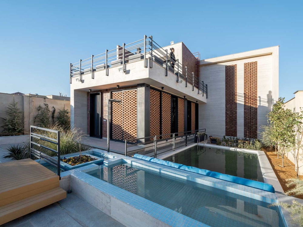 معماری ویلای مدرن پنج‌ دری با نمای آجری