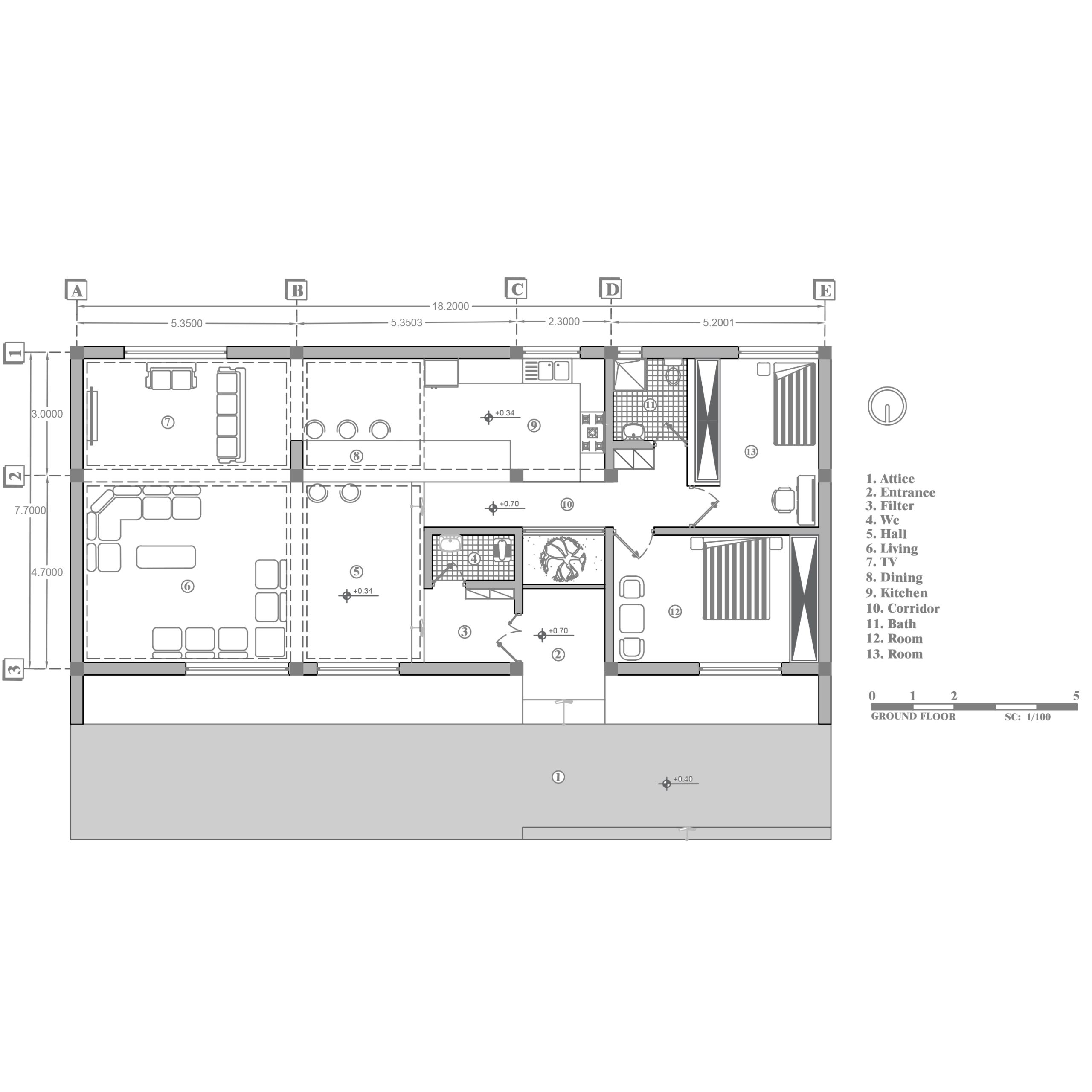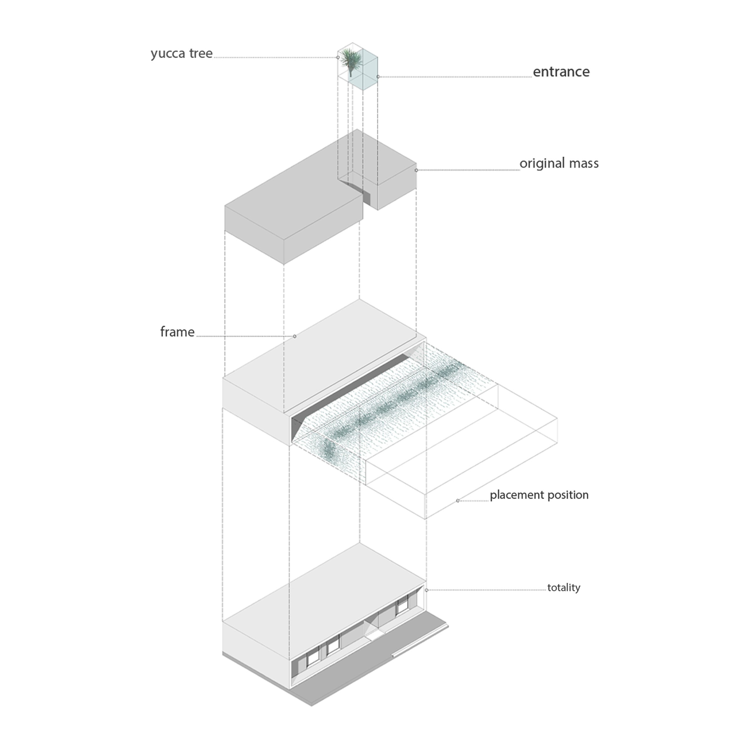 حجم اولیه این پروژه نمایی مستطیلی ارائه می دهد که با احترام به سه جزء معماری اصلی، یعنی دیوار، سقف و کف، درون آن یک حفره ترتیب داده شد که در نهایت، از طریق تبدیل ماده، یک جسم چند منظوره و مبتکر خلق کرده است.