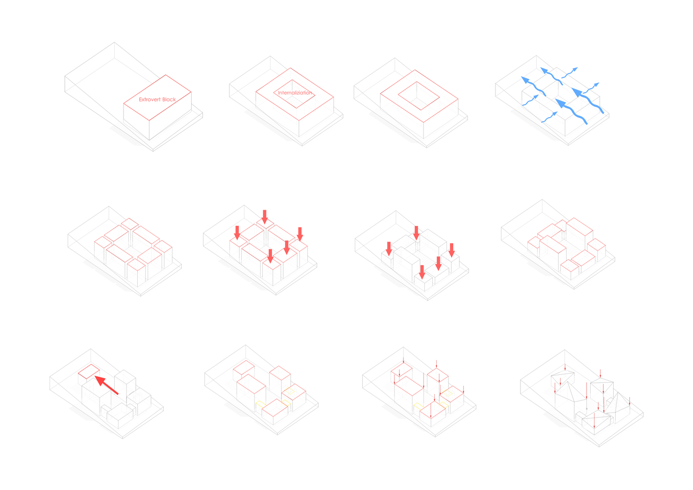 در نتیجه به هم پیوستگی این بلوک ها، تفاوت بین فضای اصلی و انتقالی اغراق آمیز و سلسله مراتبی شده است. تمامی فضاهای عمومی در طبقه همکف قرار گرفته اند و نماهای داخلی شفاف آن روبه روی هم قرار گرفته اند. این تنظیمات امکانی را برای یک تجربه بصری ایجاد می کند که در آن ساکنان می توانند نگاهی اجمالی به زندگی در فضاهای دیگر داشته باشند، گویی در حال تماشای یک فیلم صامت هستند.