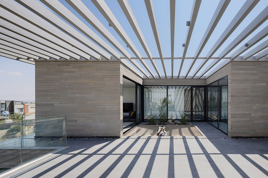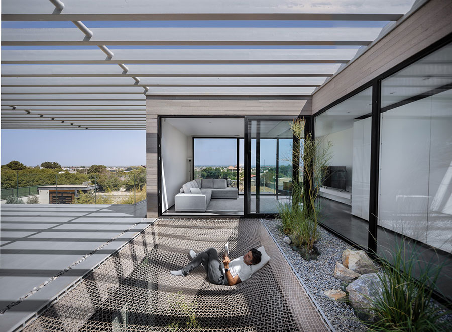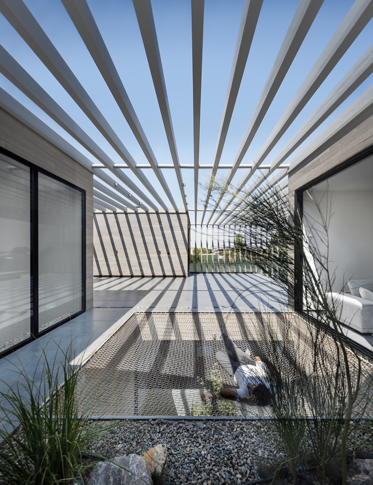طراحی ویلا شماره ۱۳ حول محور تعامل فضاهای باز، نیمه باز و محصور شکل گرفته است – ترکیبی فضایی که توسط سه حیاط بیرونی و یک پاسیوی داخلی ساختار یافته است که در کنار هم یک ریزاقلیم واسطه بین داخل و خارج ایجاد می کنند.