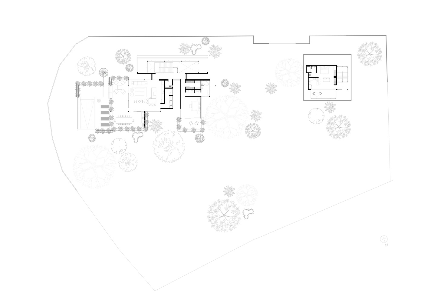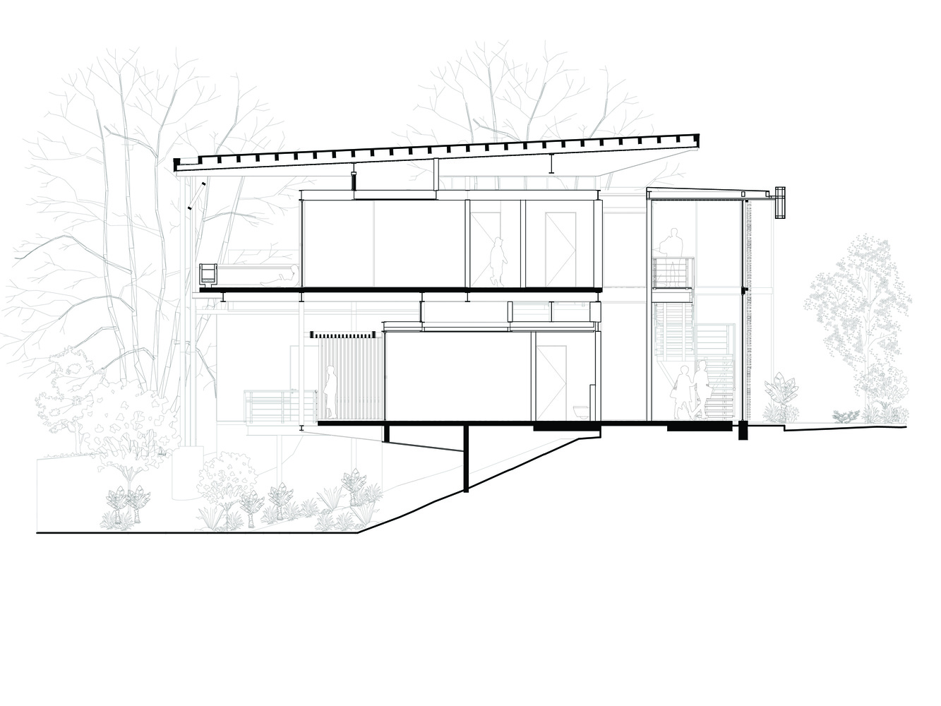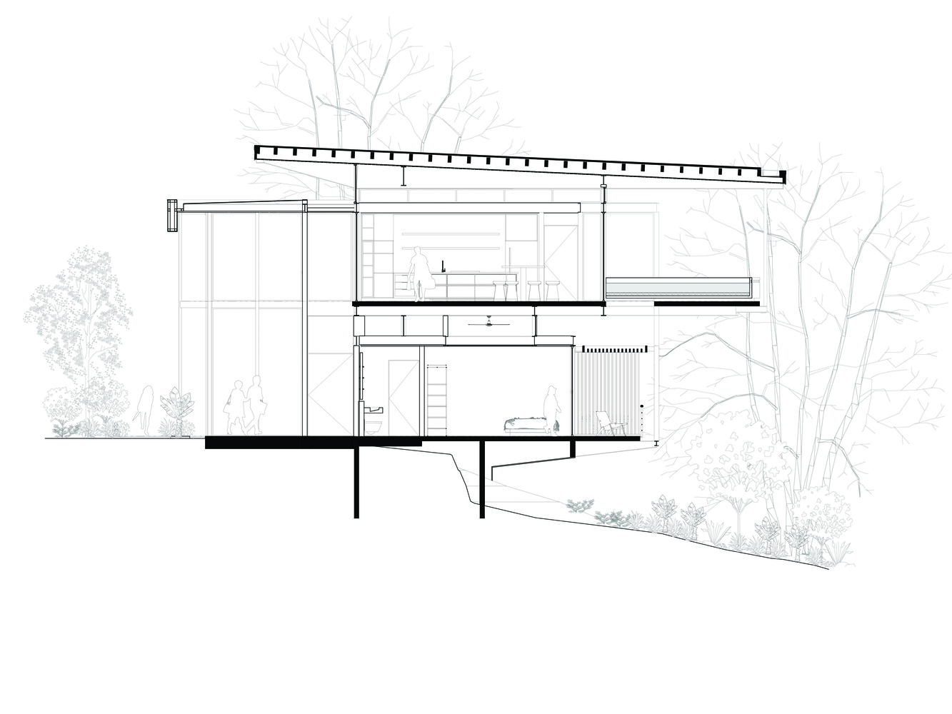 در داخل یک برف روی تاج یک تپه، یک پایه محکم و ساختار آکروباتیک کاشته‌ شده است تا بقیه خانه بتوانند بدون تکیه‌ گاه اضافی بر فراز جنگل شناور شوند. مناطق اصلی نشیمن و همچنین اتاق خواب اصلی در طبقه دوم قرار گرفتند، جایی که تجربه سایه بان جنگل با شدت بیشتری احساس می شود و همچنین در آنجا اقیانوس و غروب خورشید از طریق مناظر دقیق قاب گرفته شده است.