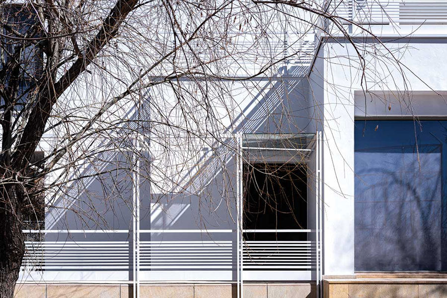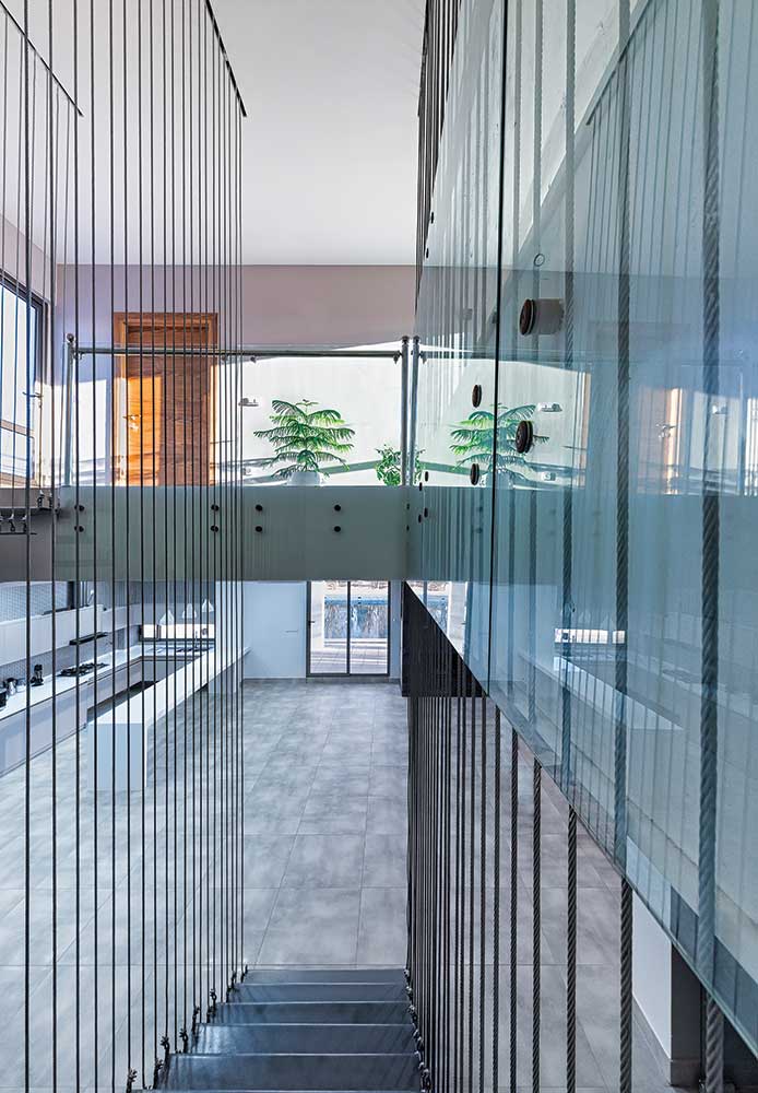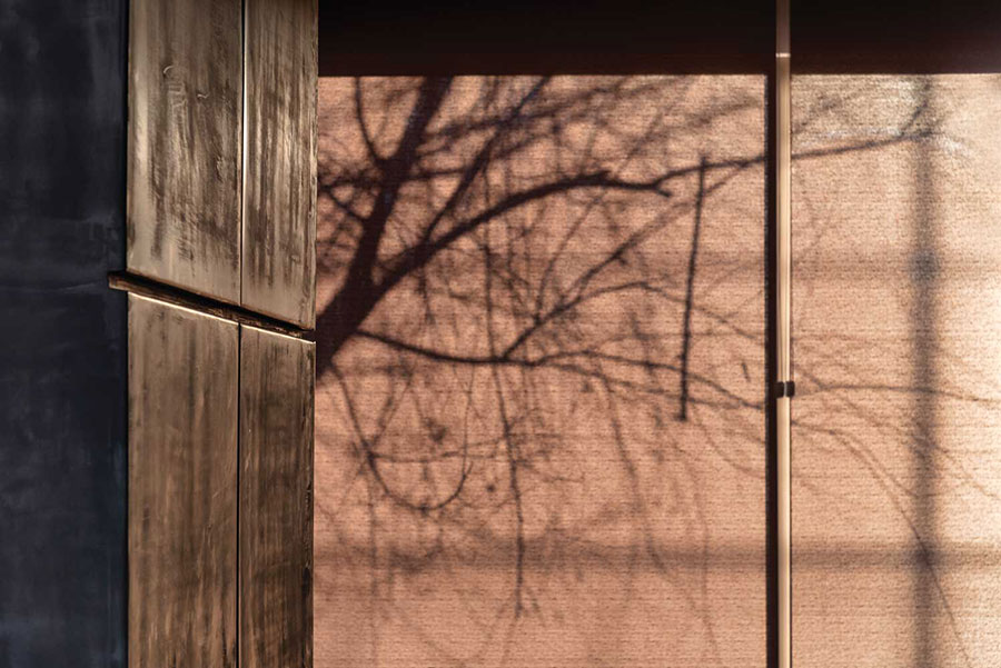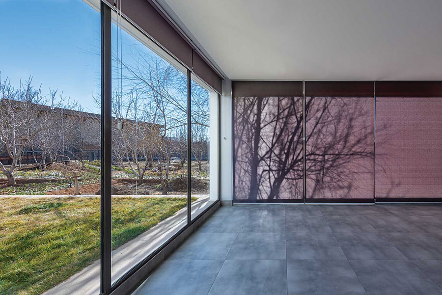 انتخاب هوشمندانه پردههای پشت جدارههای شیشهای، احساسی از کاغذ شوجی را پدید میآورند. مانع نفوذ مستقیم نور به درون میشوند و در همان لحظه جداره به مثابه بستری برای بازنمود طبیعت و آنچه پیرامون بنا جریان دارد، ظاهر میشود.