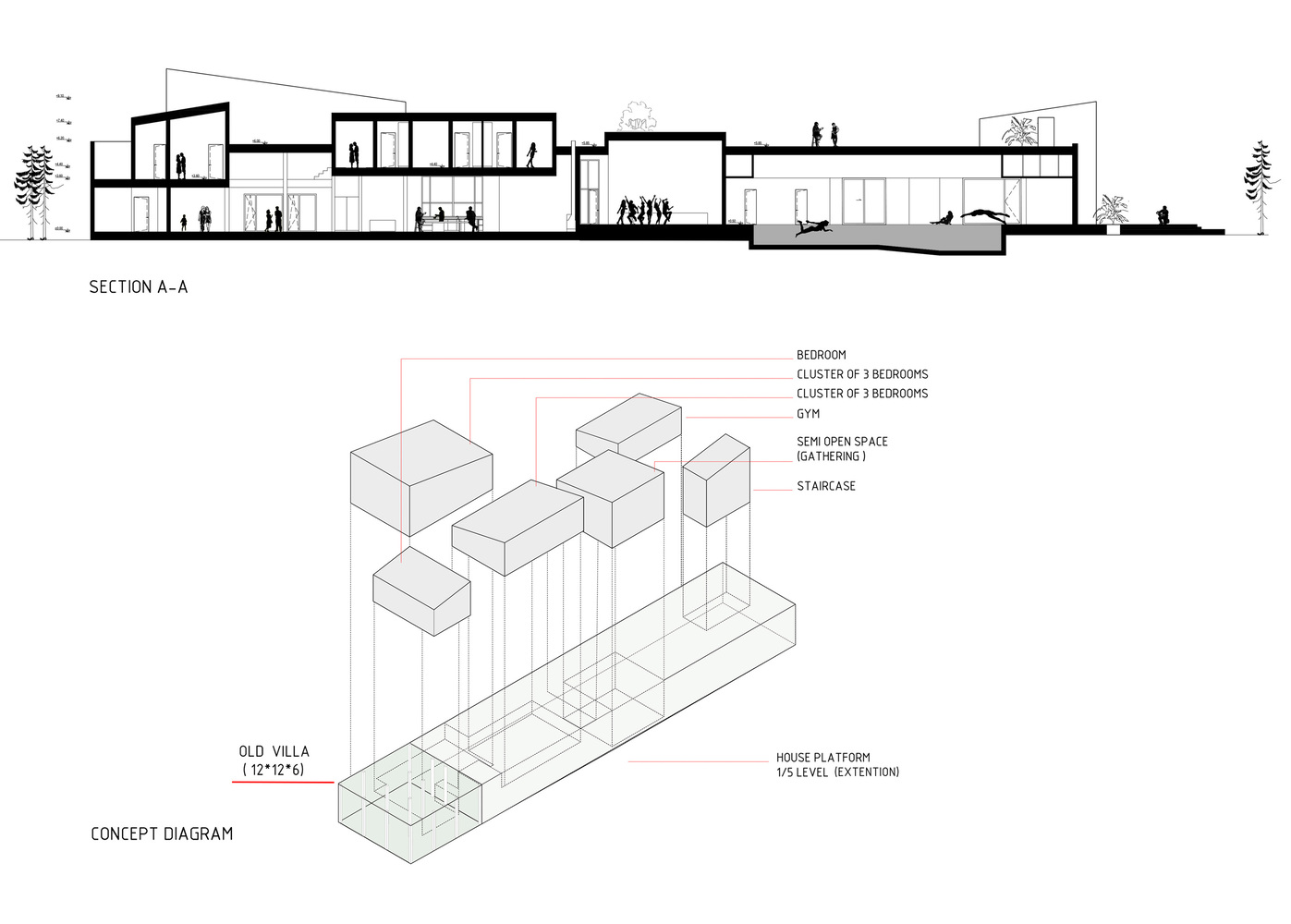 این پروژه شامل گسترش یک ویلای موجود در نزدیکی تهران است که در ابتدا برای دورهمی های خانوادگی آخر هفته استفاده می شد. خانه اصلی ۱۲ × ۱۲ متری، شامل سه اتاق خواب، دیگر نیازهای یک خانواده رو به رشد را برآورده نمی کرد و به فضای زندگی بیشتری نیاز داشت.