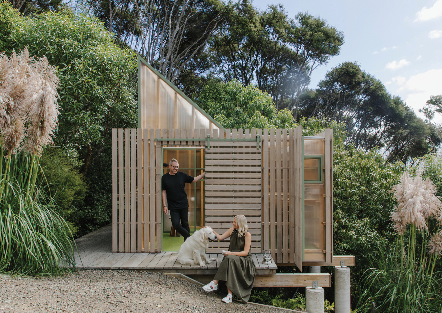 با وظیفه روشن بودن یک خانه موقتی که در محیط اطراف خود قرار می گیرد (به جای اینکه از آنها کم کند)، این ساختار با پوسته چوبی مشبک تنه های محیط خود را از خط درخت کانوکا تقلید می کند.