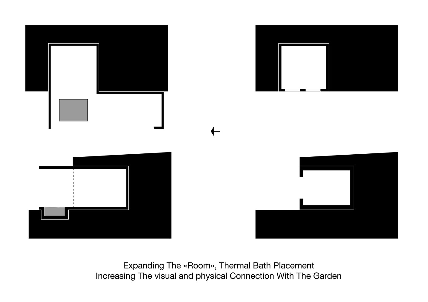 این پروژه با گسترش اتاق شروع شده است. تخریب دیوار حائل سنگی برای چسباندن پسوند، یک حمام حرارتی روی زمین ایجاد می کند، زیرا طراح نمی توانسته کف اتاق قبلی را حفر کند. اما به همین جا ختم نشده است. ایجاد یک سکو با حداکثر اتصال به باغ و رودخانه قبل از صرف وقت به خط اصلی طراحی پروژه تبدیل شده است. برداشتن دیوار سنگی به معنای ایجاد سازه ای برای حمایت از سقف و خاک بالای اتاق قدیمی بوده است. این مداخله با اتصال اسکلت فلزی همراه اشت. ظاهر حمام حرارتی ابعاد و نسبت های تقریبی فضای جدید را تعیین می کند. مرحله بعدی نصب ورق های فولادی به عنوان تکمیل و اعمال پوشش محافظ (پلی اورتان) بود.