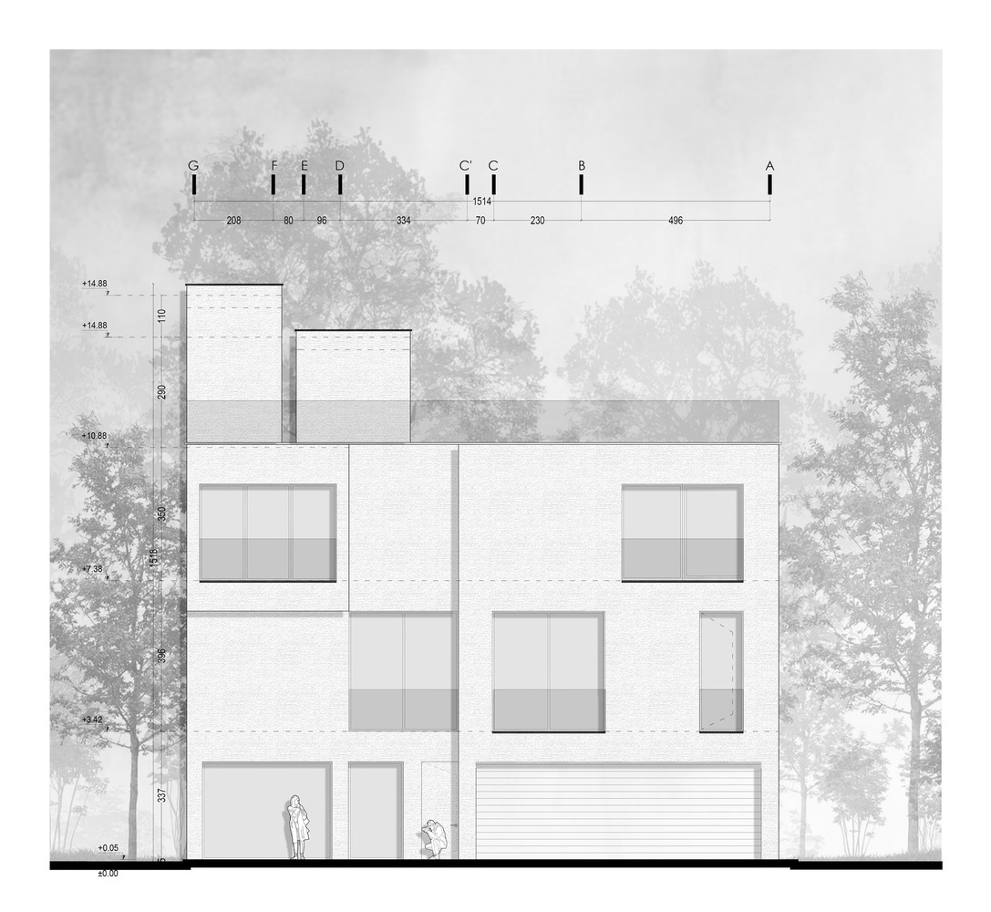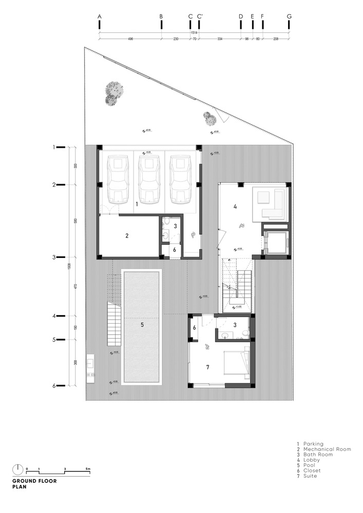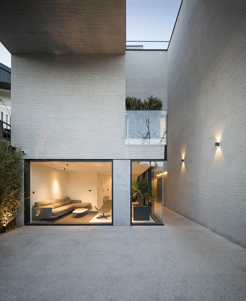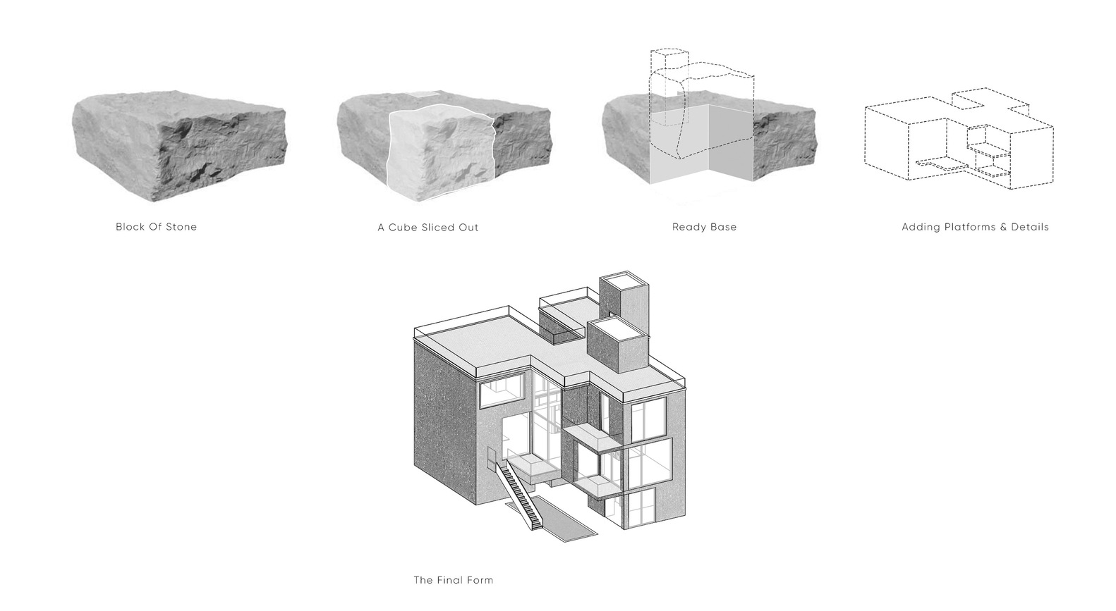 طراح ویلا خود را با دو جهت متمایز نشان می دهد: یک طرف رو به بیرون و کوچه، حسی از حریم خصوصی و صمیمیت را ارائه می دهد، در تضاد با نمای حیاط که حجم سنگ از نظر زیبایی شناسی طراحی و حجاری شده است. این پروژه از بیرون اسرارآمیز و دعوت کننده است و بینندگان را به کاوش در فضای درون به چالش می کشد در حالی که در درون، این رمز و راز به وضوح و باز بودن تبدیل می شود.