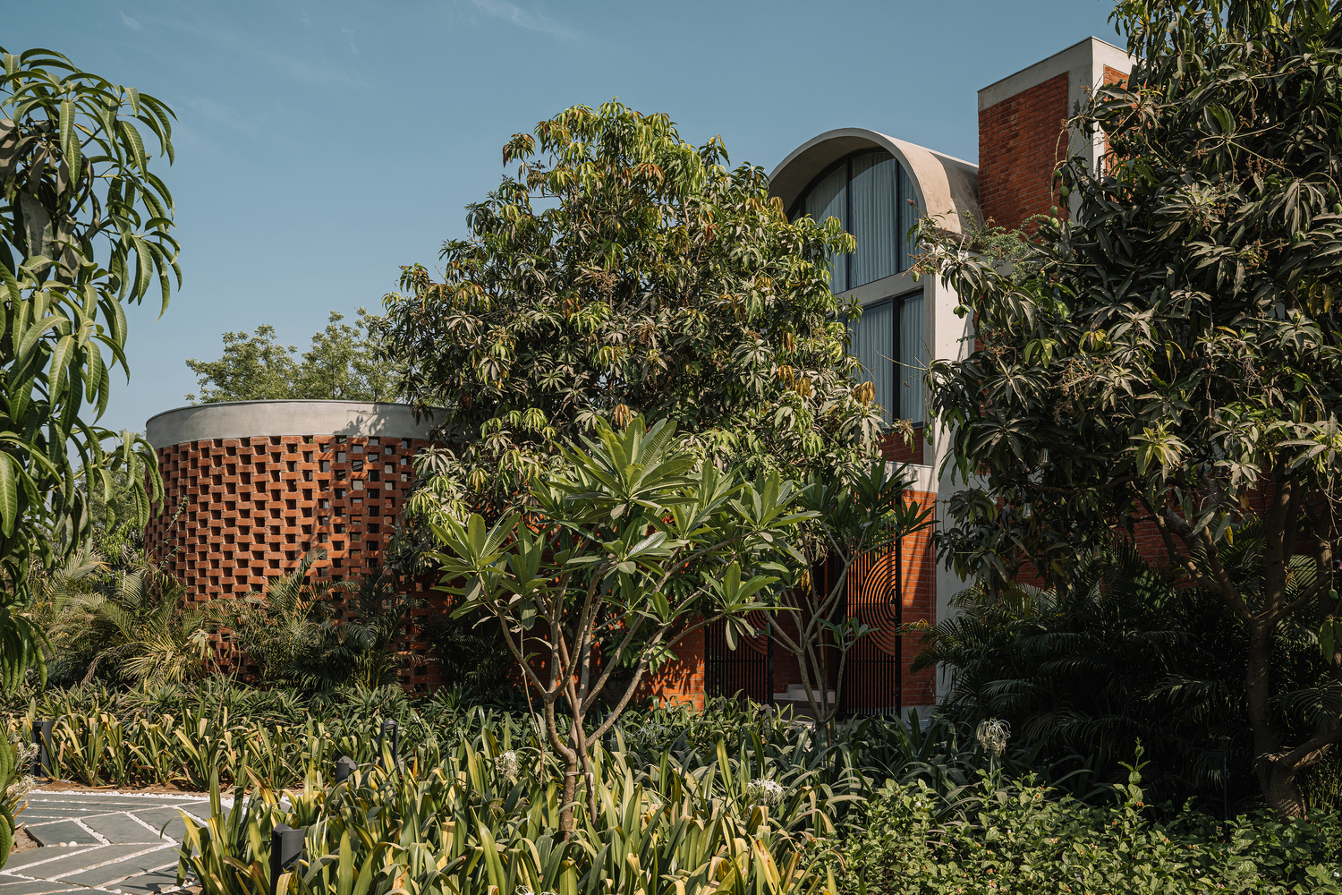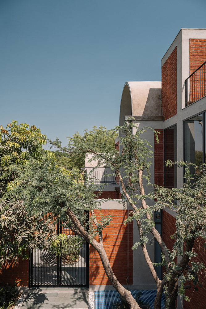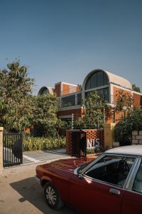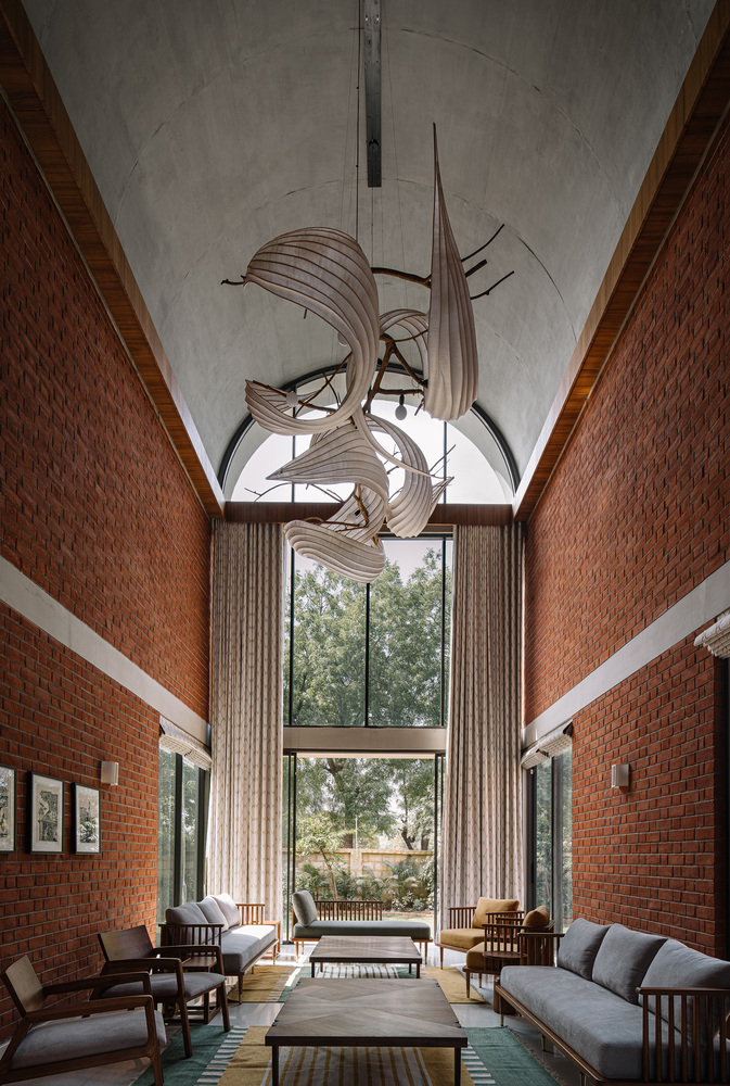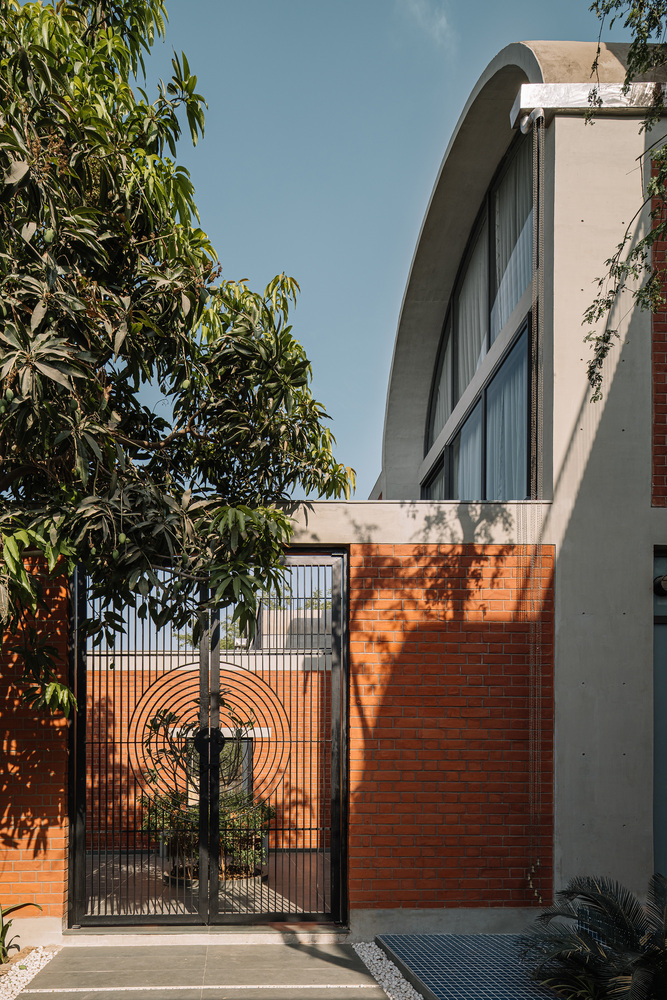 طراحی ویلا فوق بر پایه مصالح سنتی بنا شده است. دیوارهای آجری نمایان و باربر، پس زمینه ای برای خطوط تمیز طاق های بتنی تشکیل می دهند. کفپوش های موزاییکی سفید مایل به کرم، با رگه های ظریفی از رنگ، در سراسر خانه امتداد یافته اند و مبلمان ساج محکم و سفارشی و تزئینات برنجی را تکمیل می کنند. تمام خدمات، از جمله تهویه مطبوع و روشنایی، نمایان رها شده اند – به عنوان بخش های جدایی ناپذیر معماری به جای اینکه به عنوان عناصر فرعی پنهان شوند، مورد توجه قرار گرفته اند.